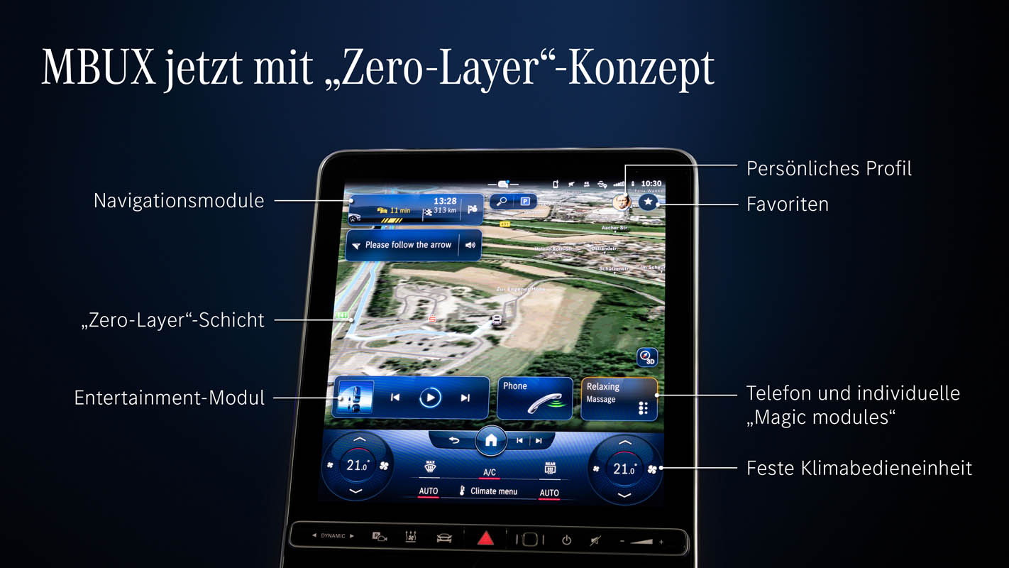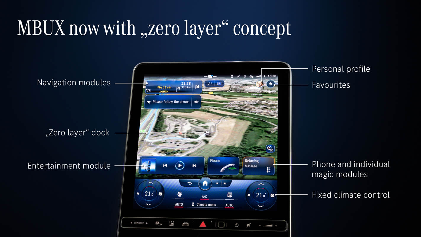 In the electric luxury saloon EQS, Mercedes-Benz has taken MBUX operation to a new level. In future, drivers of a Mercedes-Benz or Mercedes-Maybach S-Class will also benefit from the latest version of this adaptive system: with the zero-layer design, the user does not have to scroll through submenus or give voice commands. The most important applications according to the situation and context are visible on the top level in the direct field of vision.