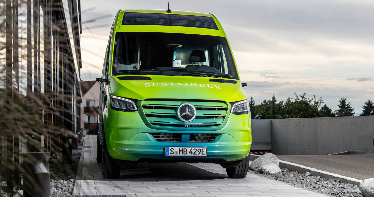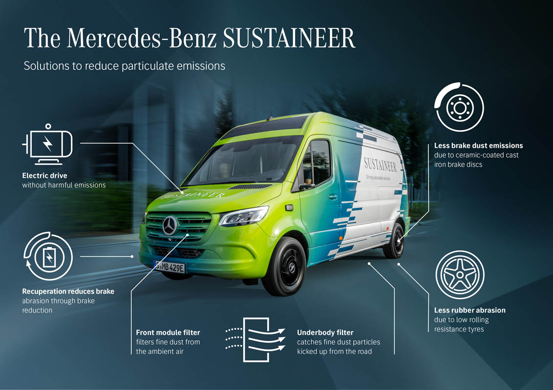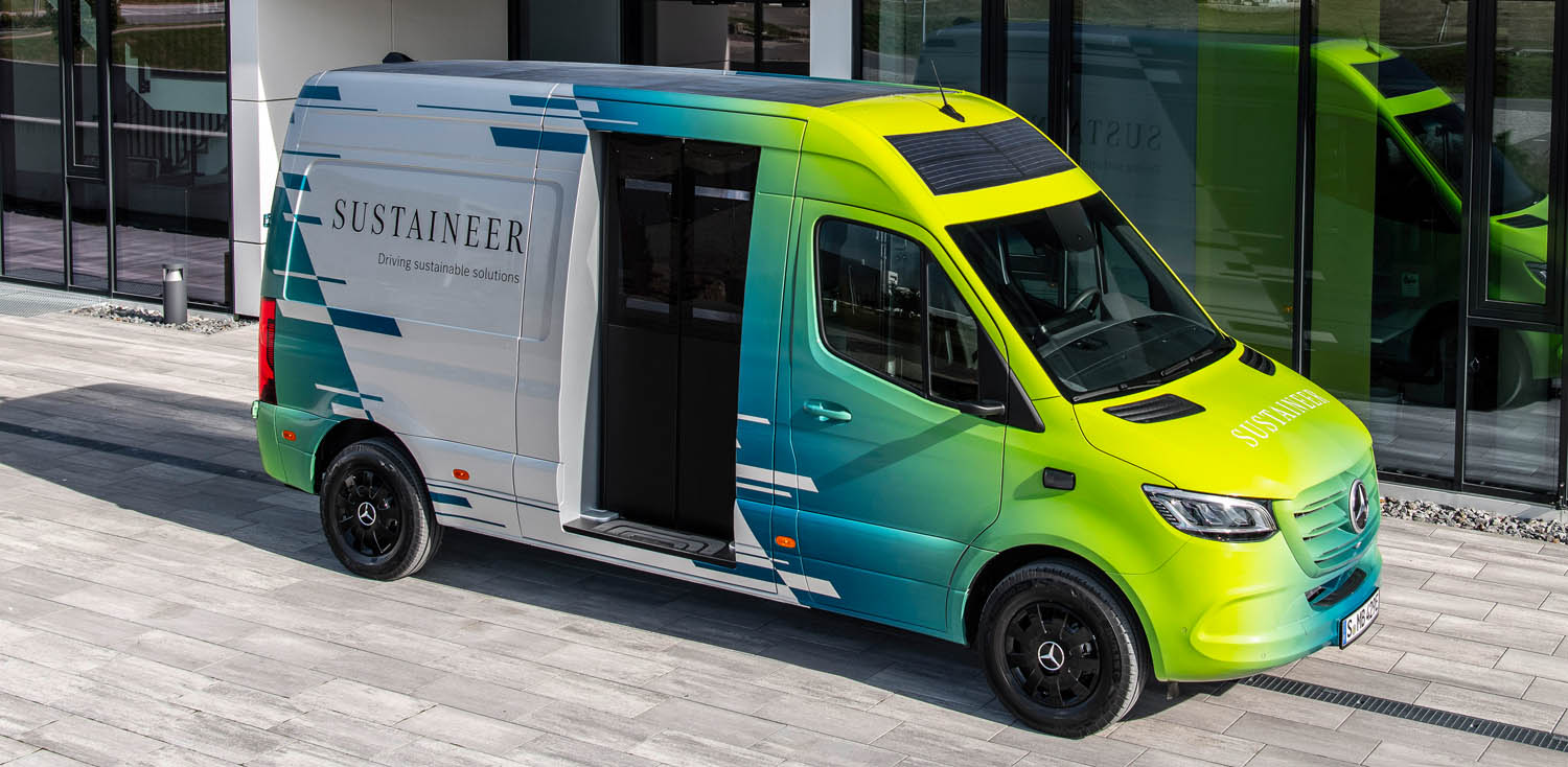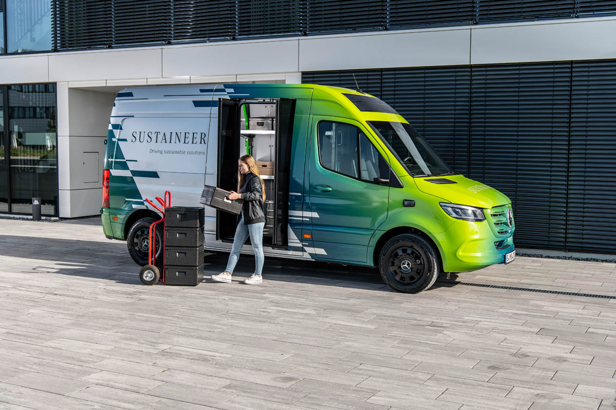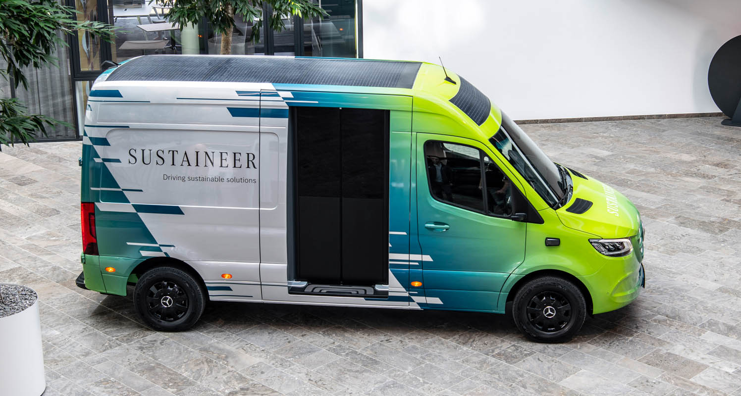 Last-mile vans that are climate neutral, produce their own green electricity and can actively improve the air quality in cities: with its technology demonstrator, the Sustaineer (SustainABILITY PIONeer), Mercedes‑Benz Vans is providing us with a tangible impression of just how sustainability in urban delivery operations may look in the future. The fully electric van based on the Mercedes-Benz eSprinter combines a variety of innovative solutions designed to improve the quality of life in cities, to conserve resources and protect the climate, and to better the health and safety of the driver and other road users. These include a fine particle filter on the front module and underbody, a solar panel on the roof, component parts made of recycled materials as well as a heating system which is close to the body. The innovations and technical solutions that the SUSTAINEER is fitted with have been designed with the possibility of series production in mind, so that their use in future Mercedes-Benz Vans vehicle generations is feasible.