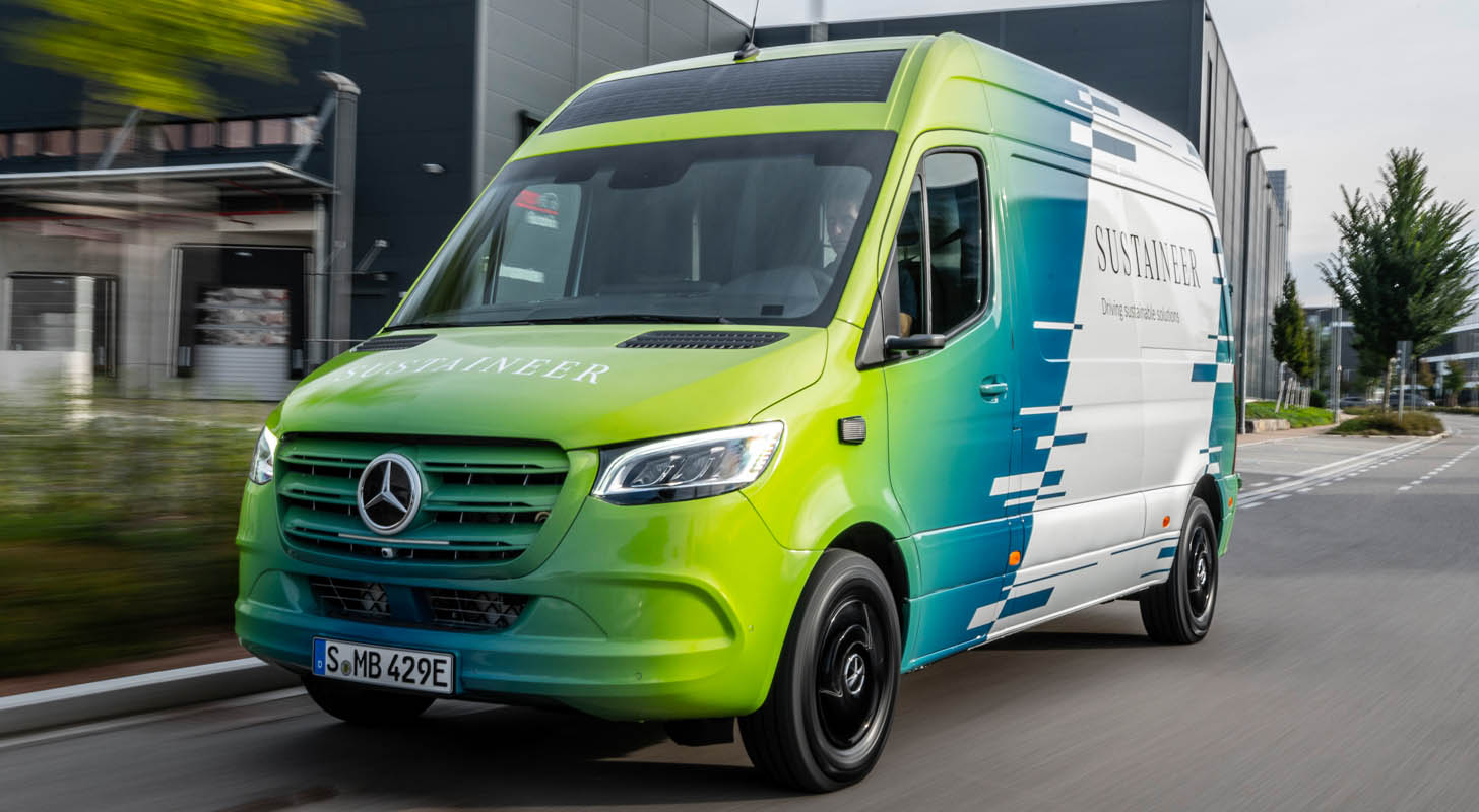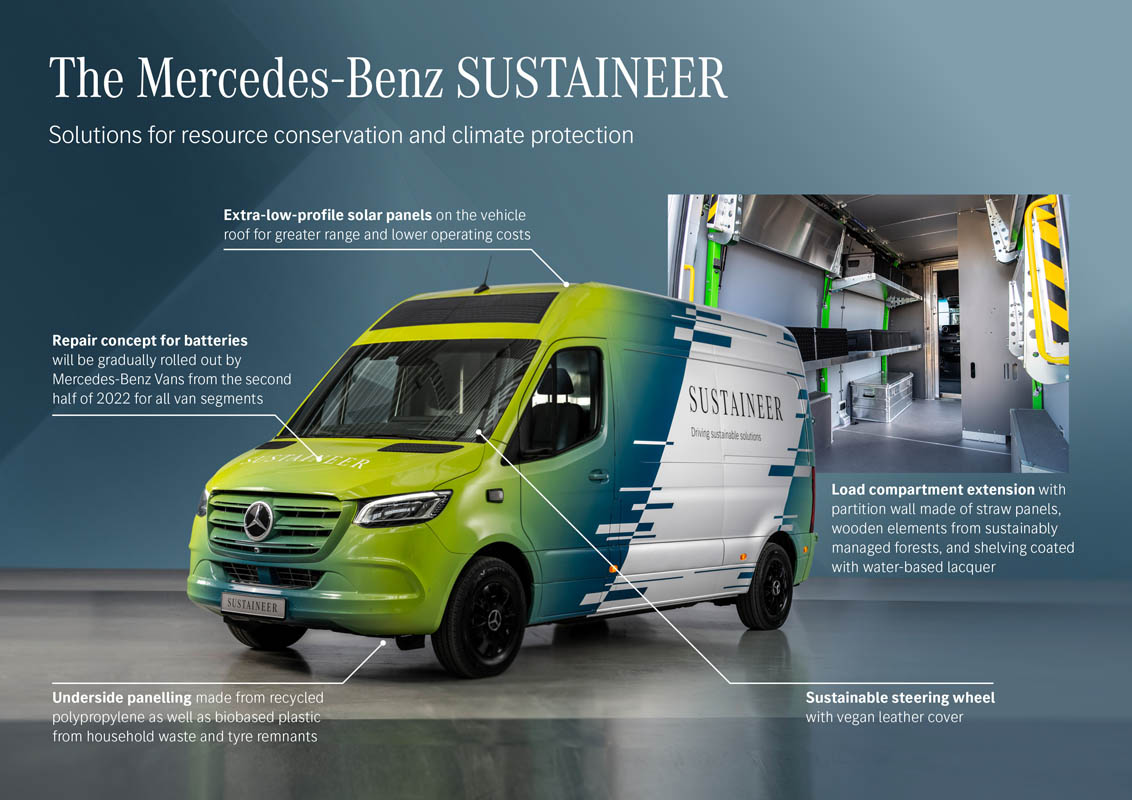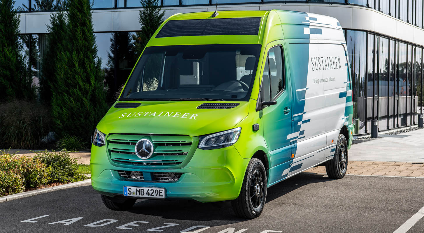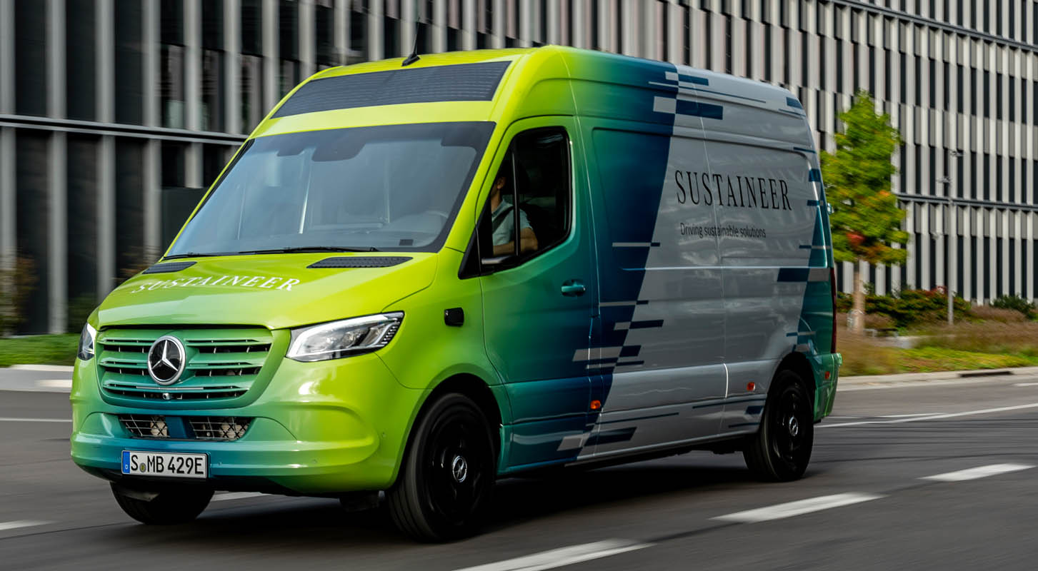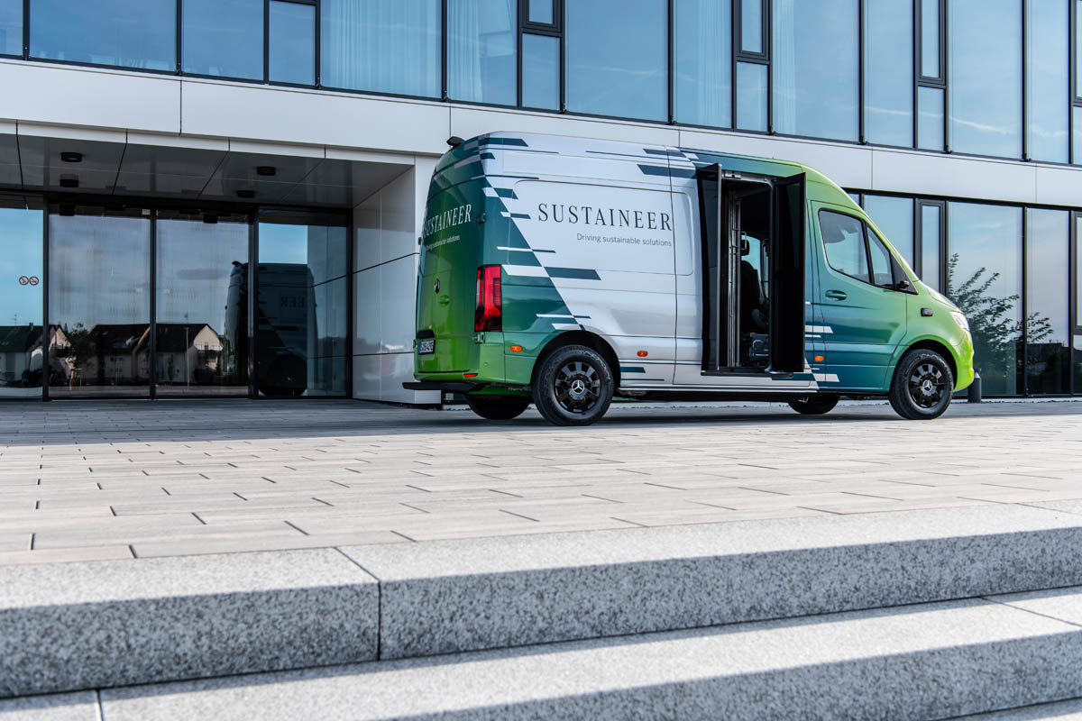 Last-mile vans that are climate neutral, produce their own green electricity and can actively improve the air quality in cities: with its technology demonstrator, the Sustaineer (SustainABILITY PIONeer), Mercedes‑Benz Vans is providing us with a tangible impression of just how sustainability in urban delivery operations may look in the future. The fully electric van based on the Mercedes-Benz eSprinter combines a variety of innovative solutions designed to improve the quality of life in cities, to conserve resources and protect the climate, and to better the health and safety of the driver and other road users. These include a fine particle filter on the front module and underbody, a solar panel on the roof, component parts made of recycled materials as well as a heating system which is close to the body. The innovations and technical solutions that the SUSTAINEER is fitted with have been designed with the possibility of series production in mind, so that their use in future Mercedes-Benz Vans vehicle generations is feasible.