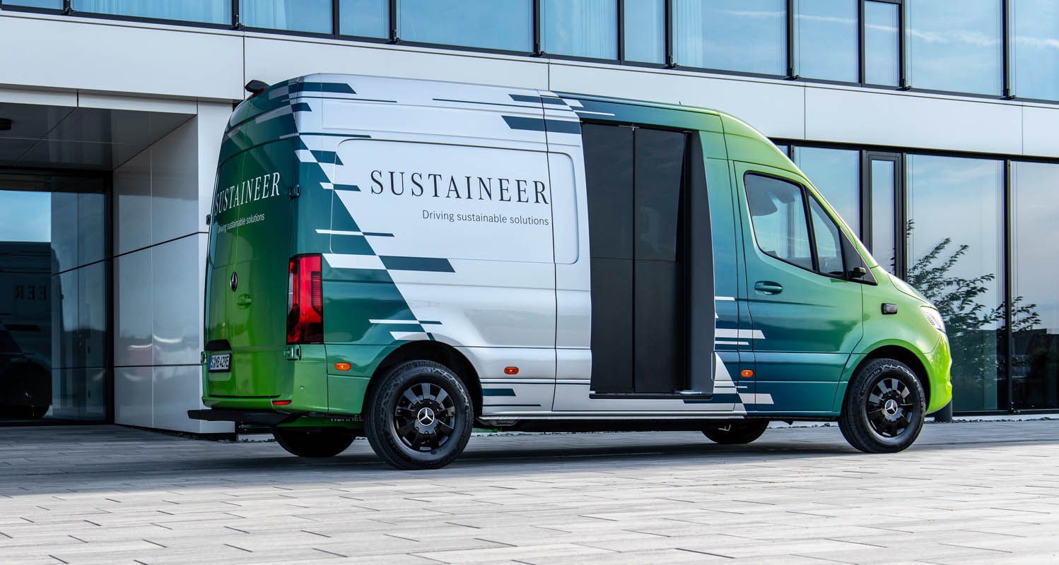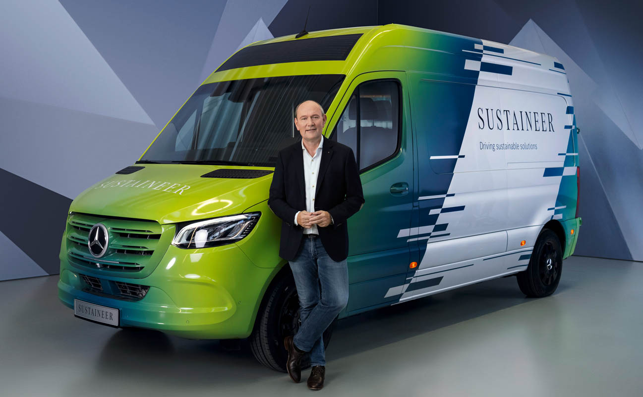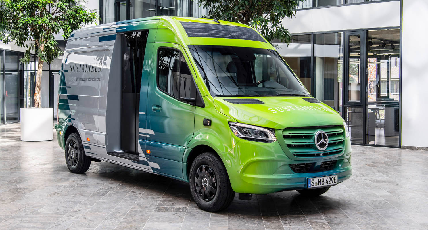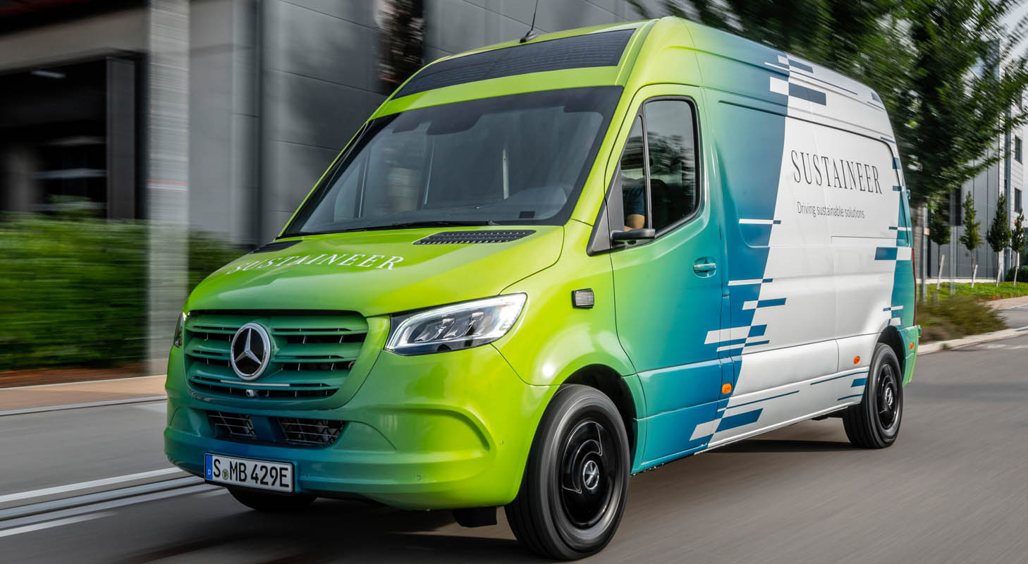 Last-mile vans that are climate neutral, produce their own green electricity and can actively improve the air quality in cities: with its technology demonstrator, the Sustaineer (SustainABILITY PIONeer), Mercedes‑Benz Vans is providing us with a tangible impression of just how sustainability in urban delivery operations may look in the future. The fully electric van based on the Mercedes-Benz eSprinter combines a variety of innovative solutions designed to improve the quality of life in cities, to conserve resources and protect the climate, and to better the health and safety of the driver and other road users. These include a fine particle filter on the front module and underbody, a solar panel on the roof, component parts made of recycled materials as well as a heating system which is close to the body. The innovations and technical solutions that the SUSTAINEER is fitted with have been designed with the possibility of series production in mind, so that their use in future Mercedes-Benz Vans vehicle generations is feasible.