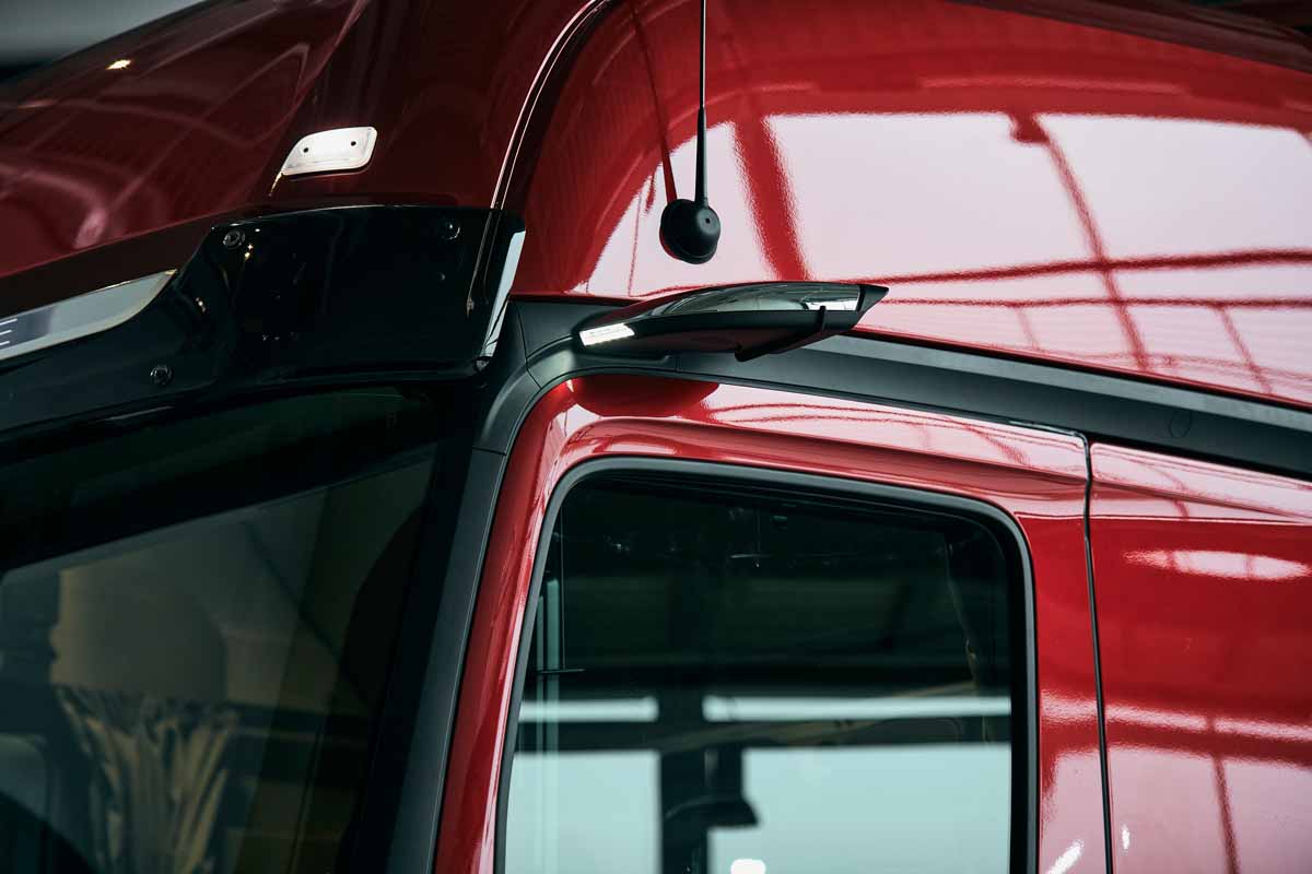 The exterior of the second MirrorCam generation stands out because the camera arms on both sides have been shortened by ten centimeters. This applies to both the narrower and wider cab and has the advantage, among other things, that drivers can reverse in a straight line more easily than with the first MirrorCam generation. This particularly comes as a result of MirrorCam’s perspective now being even more akin to that of conventional glass mirrors. Shorter dimensions bring about another advantage because with the 2.50-metre wide cab, the camera arm now protrudes no further than the kerb mirror which is within drivers’ plain sight. Collisions with objects at the edge of the road are now virtually impossible. Thanks to the width of the chassis being identical, this also applies to the 2.30-metre wide cab variant.