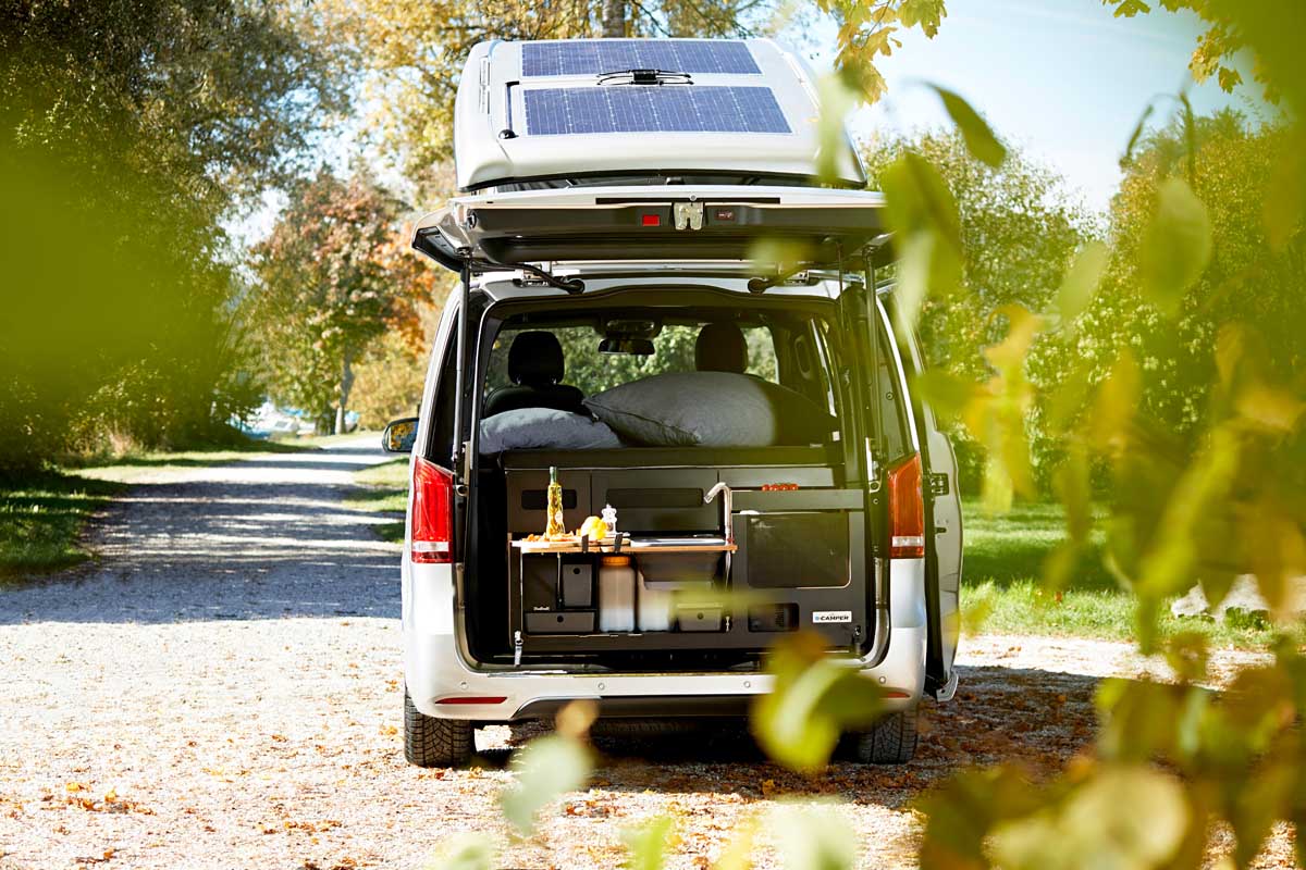Sortimo’s conversion concept is modular[5]. Full-range options include a pop-up roof with roof bed and a multifunction box with bed and kitchen unit. You will find this in the luggage compartment of the vehicle. The kitchen unit uses a drawer system and features include a sink, a two-ring removable gas cooker, a refrigerator box, and drawers for cutlery, cooking utensils and supplies. The bed system is installed above the kitchen unit. This can be unfolded in a few simple steps to create a bed that is precisely tailored to the vehicle width of the EQV. When folded, the rear seats can be used without restriction. The special feature of the camping modules is their lightweight construction. This pays off especially when used in an electric van, because every kilogramme saved means greater range. The two solar panels with a total output of around 400 watts, which Sortimo can install on request, are also particularly light and ensure additional self-sufficiency. They charge both the starter battery and the auxiliary battery for camping. Further equipment includes among others: darkened rear windows, interior lighting for the rear compartment, including integrated USB ports, and swivelling driver and front passenger seats.
