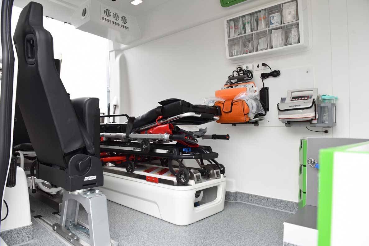 Despite the installations necessary in the patient compartment, the electric ambulance transport vehicle doesn’t exceed the permissible gross weight of 3.5 tonnes. In this light, even drivers who only have a passenger car driving licence can carry out patient transport operations.