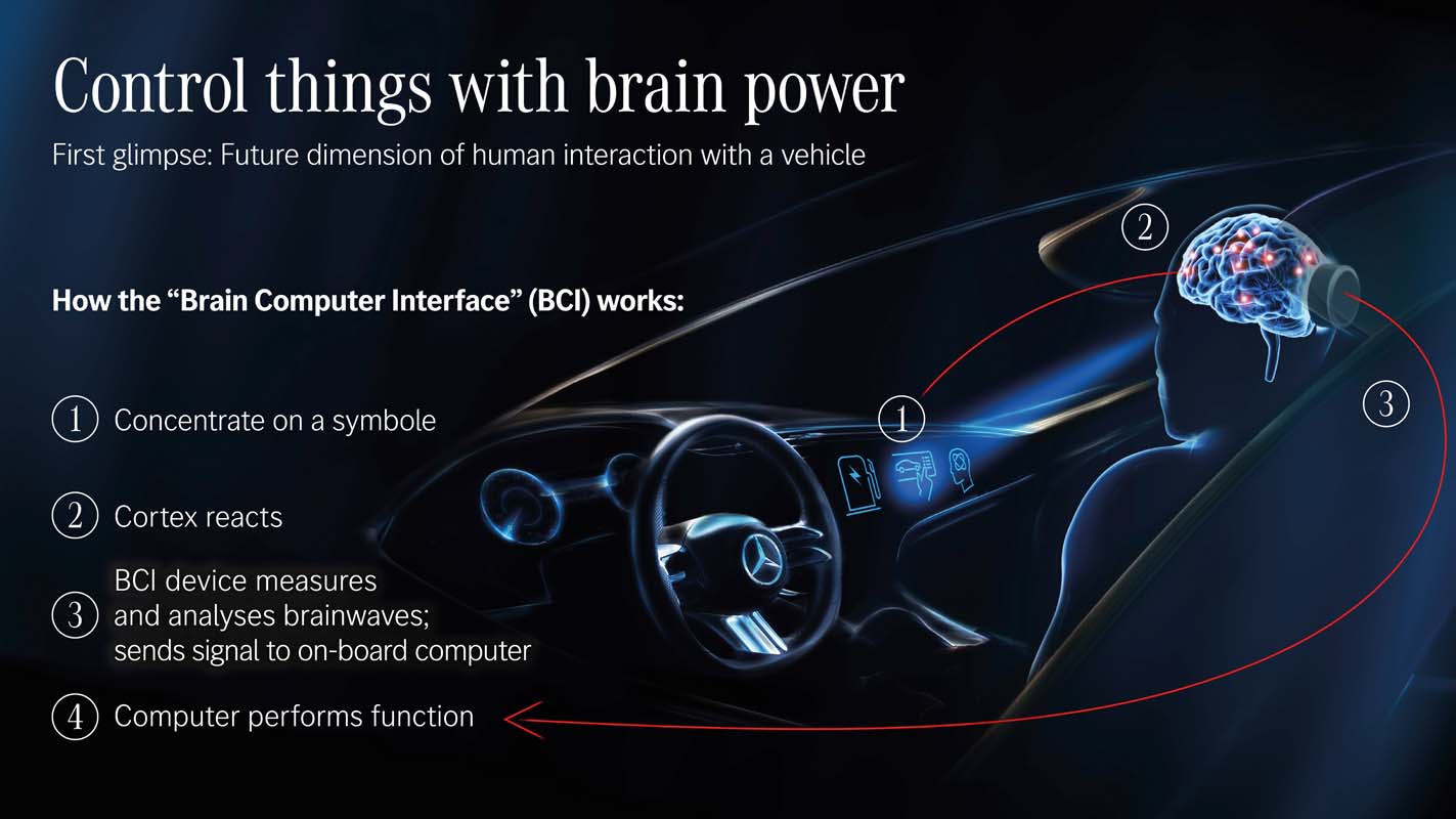 “Mercedes-Benz is setting another milestone in the merging of man and machine with the research and development of brain-computer interface applications in cars. BCI technology has the potential to further enhance driving comfort in the future, for example,” said Britta Seeger, Member of the Board of Management of Daimler AG and Mercedes-Benz AG, responsible for Sales. “Mercedes-Benz has always pioneered intelligent, innovative solutions to provide our customers with the best product and service experience. BCI technology works completely independently of speech and touch. This opens up revolutionary possibilities for intuitive interaction with the vehicle.”