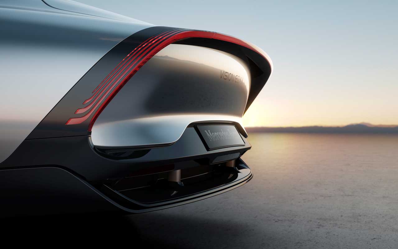 Despite the practical challenges and the compressed timescale, the success of the collaboration is evident in the sophistication and poise of the exterior design. The surfaces of the Vision EQXX run smoothly from the front, developing powerful yet sensual shoulders above the rear wheel arches. This natural flow concludes with a cleanly defined, aerodynamically effective tear-off edge accentuated by a gloss-black end trim, punctuated by the rear light clusters.
