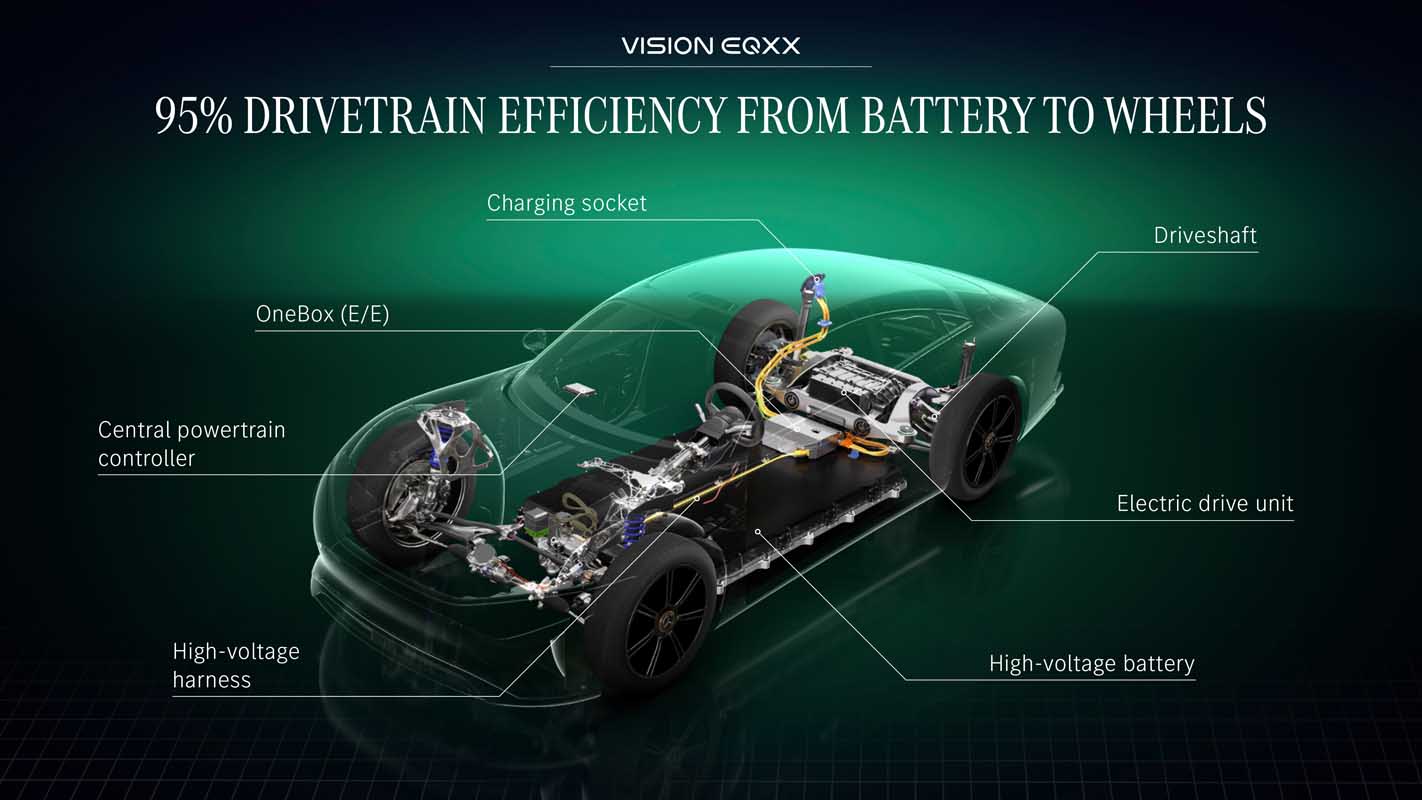 The electric drive unit in the Vision EQXX is a dedicated unit consisting of the electric motor, transmission and power electronics featuring a new generation of silicon carbides. The power electronics unit is based on the upcoming Mercedes-AMG Project ONE hypercar.