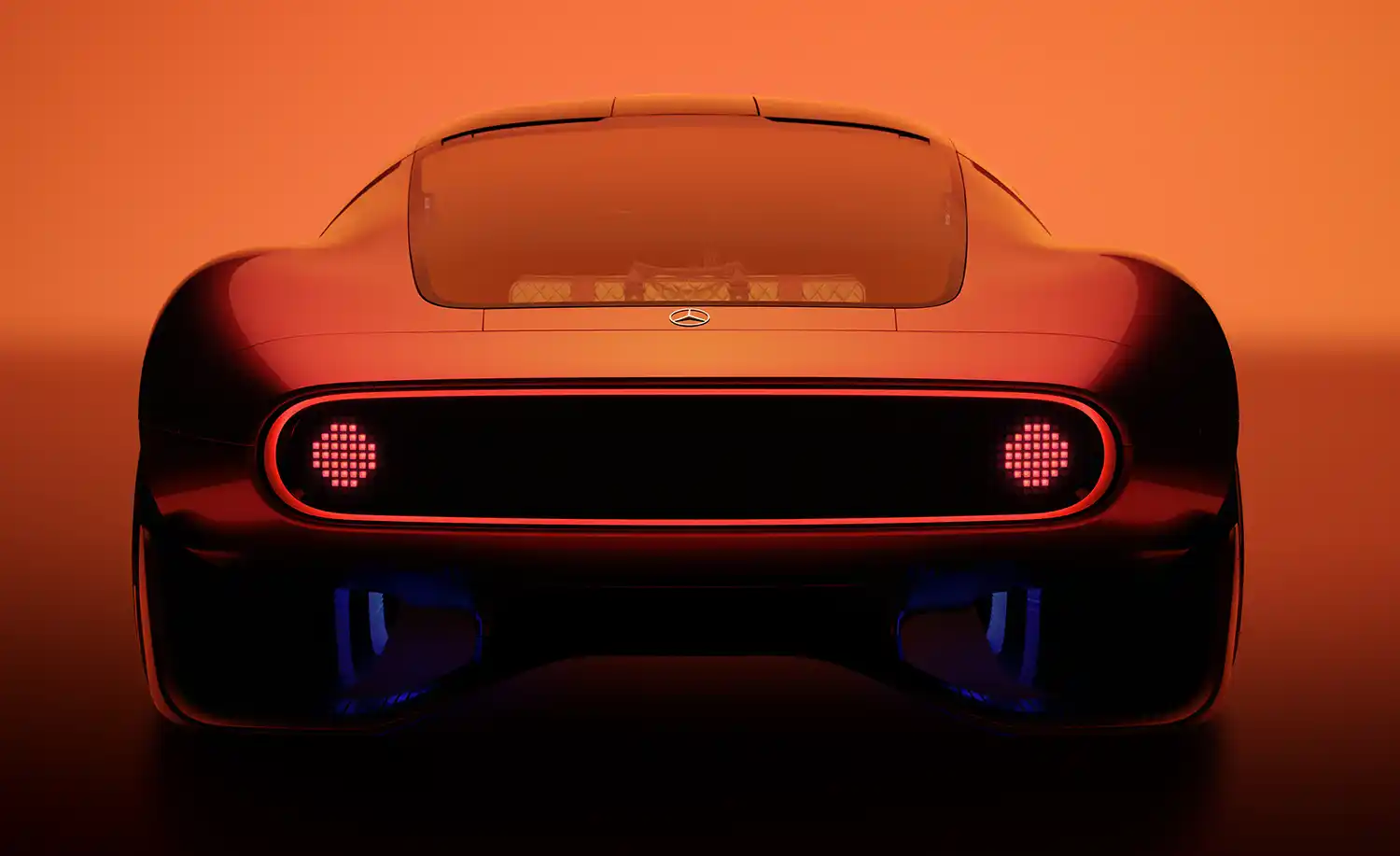 From the frontal aspect, too, the Mercedes-Benz Vision One-Eleven is powerfully evocative of the C 111. In detail, however, there are striking differences: One stand-out example is the distinctive front end, which on both vehicles consists of a low-lying rectangular element with rounded ends left and right. On the C 111, this is a closed plastic element with a honeycomb structure, fitted with round foglamps. The corresponding part on the Vision One-Eleven appears very similar at first glance. However, upon closer inspection, it reveals itself as a high-tech feature. The panel is a flexible external display with a 3D pixelated look. It interprets the C 111’s characteristic round lights in digitised form and can also convey messages to other road users.