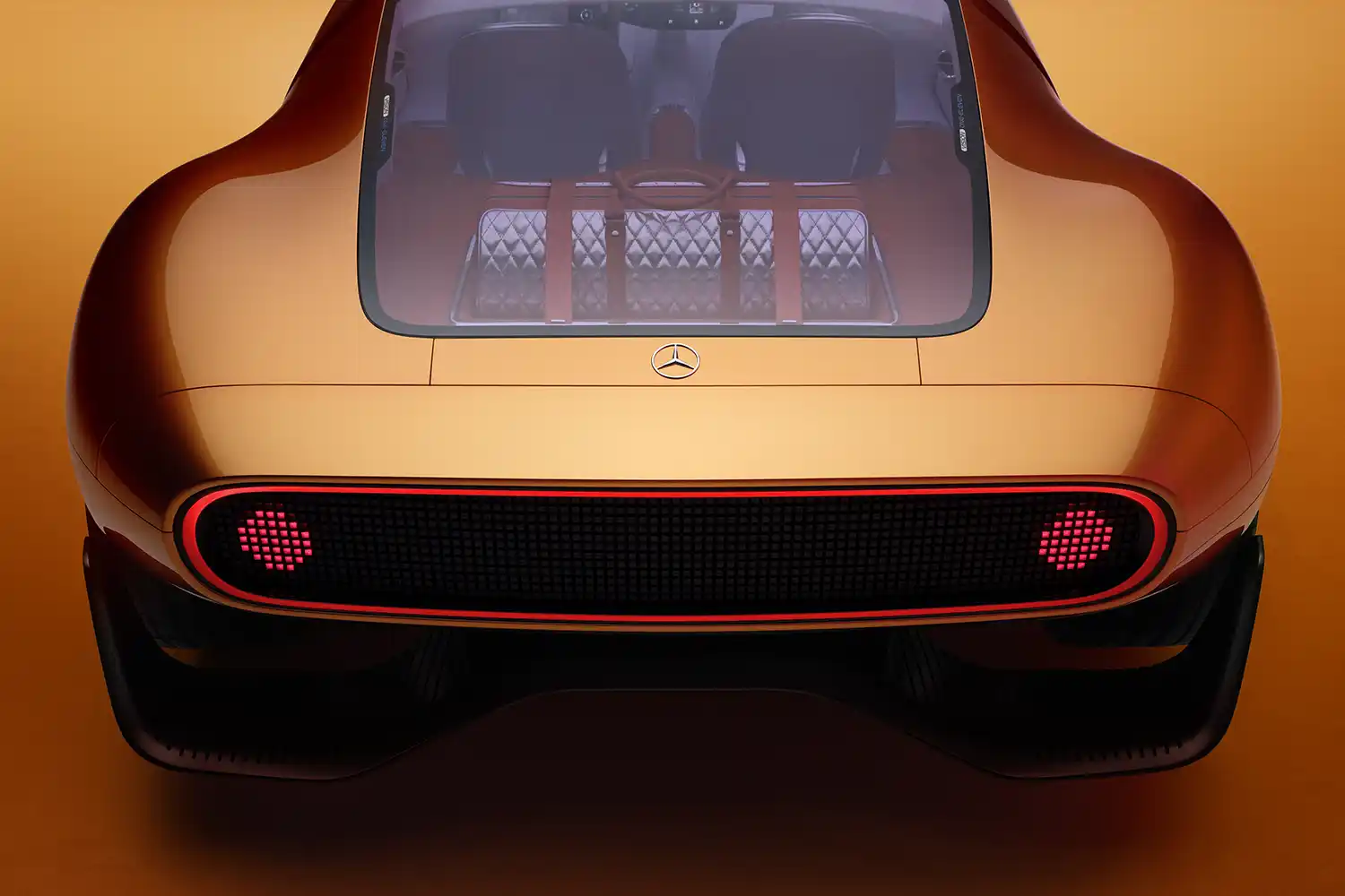 Further notable features of the side view include the flush-fit gullwing doors and the side windows, which are opaque from the outside and camouflaged by a pixelated pattern. Yet another is the large-diameter wheels inserted seamlessly into the wheel arches beneath voluminous flared wings. This reinforces the impression of an uncompromisingly sporty and aerodynamically refined driving machine. The wheel design incorporates powerfully structured elements evocative of electric motor windings – a clear indicator of the state-of-the-art, all-electric powertrain underpinning the Mercedes-Benz Vision One-Eleven. They stand in spirited contrast to the vehicle’s iconic, minimalist and smooth surface design, which is more akin to a sculptural art piece. This contrast is typical of the X-factors the brand applies to its design thinking and a distinctive feature of the Vision One-Eleven.