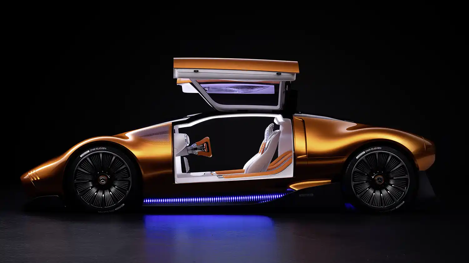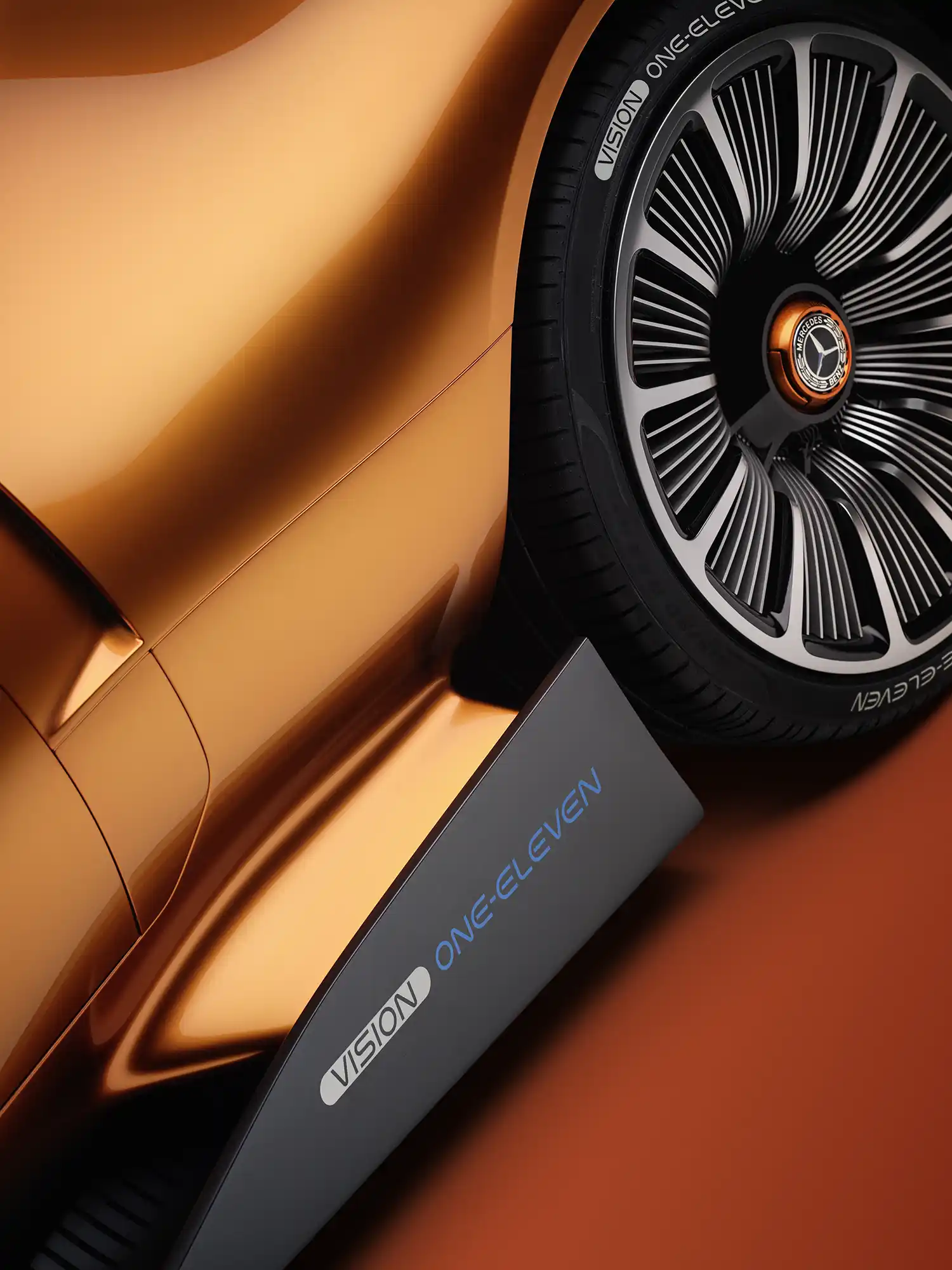 The Mercedes-Benz Vision One-Eleven is inspired by the tradition of the legendary C 111 experimental vehicles from the 1960s and 70s, which were used to test revolutionary Wankel and turbodiesel engines. They were also prototypes for testing polymer-based bodyshells. The extremely (aero)dynamic mid-engine sports cars are considered design icons of their era, not least due to their distinctive gullwing doors and eye-catching orange-and-black paintwork.