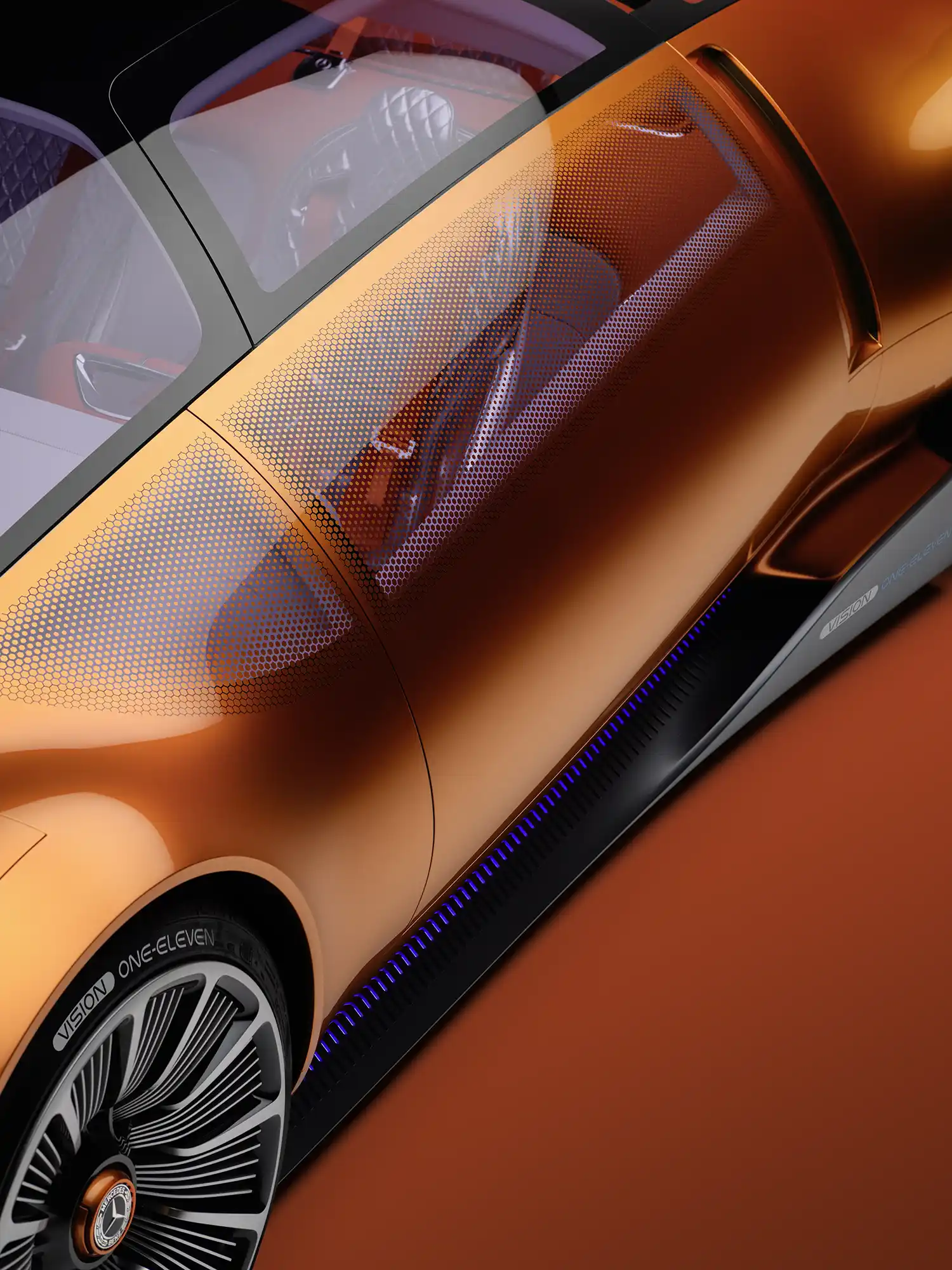 The body of the Mercedes-Benz Vision One-Eleven centres on skilful execution of the One-Bow design. From the low-slung front end to the muscular hind quarters, it runs in a smooth bow that endows the just 1,170 mm-high vehicle silhouette with an extremely sculptural feel. This harmonises perfectly with the copper-orange alubeam paintwork. It provides an unmistakeable reference to the distinctive colour of the C 111 without adopting it one-to-one. The colour of the Mercedes-Benz Vision One-Eleven is considerably more powerful than that of the C 111 and also changes with the light. It conveys not only a sense of quality but also a certain extravagance.