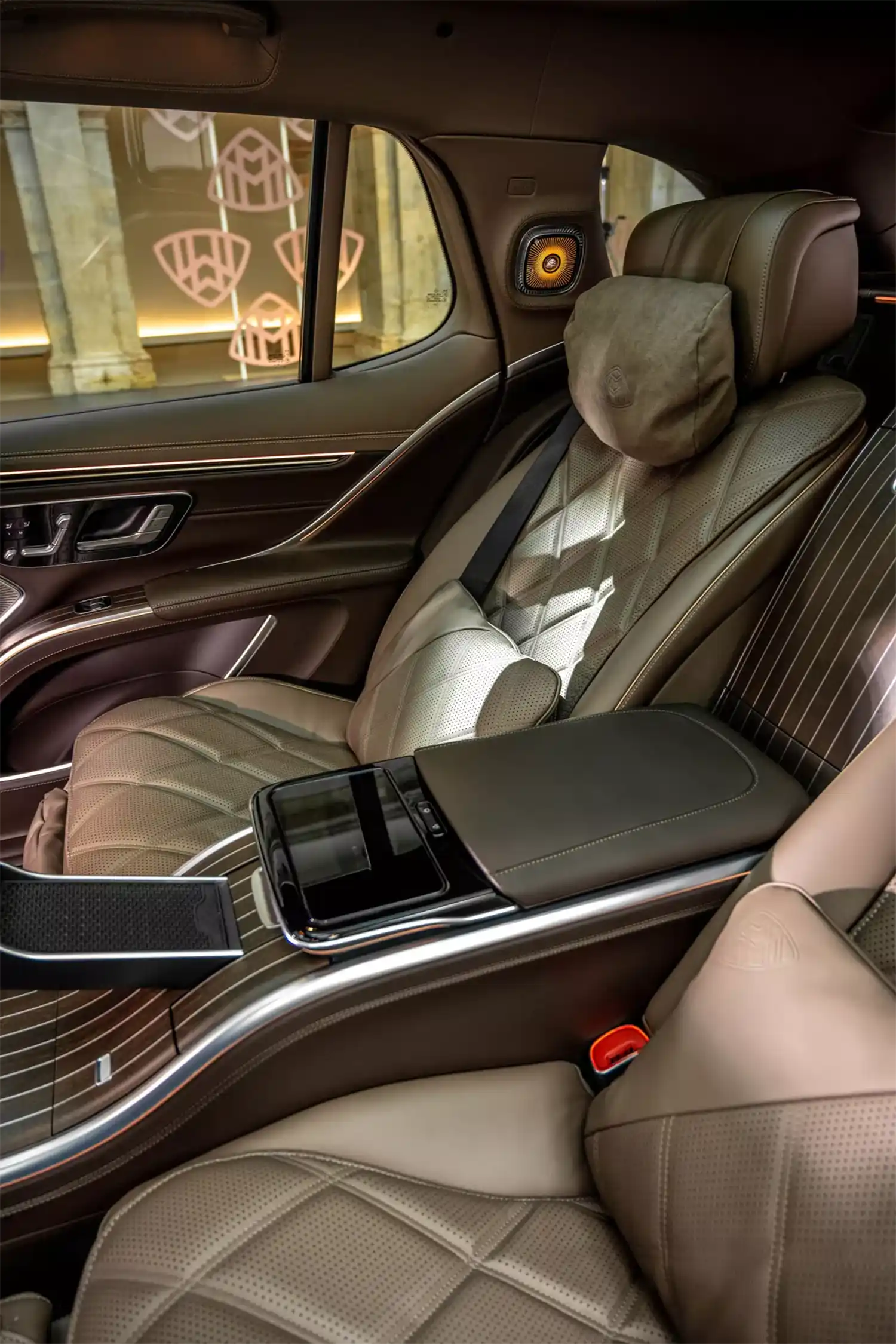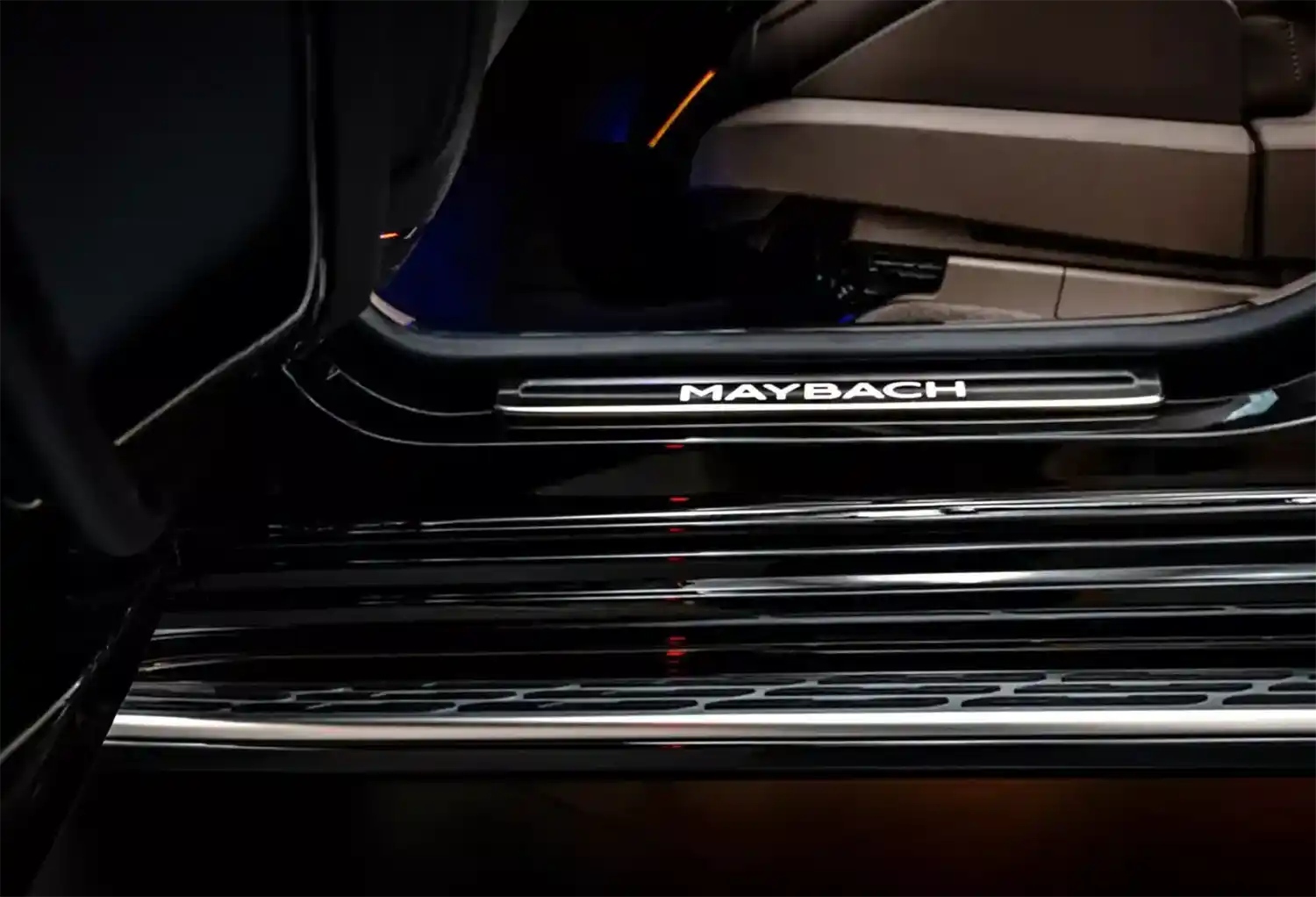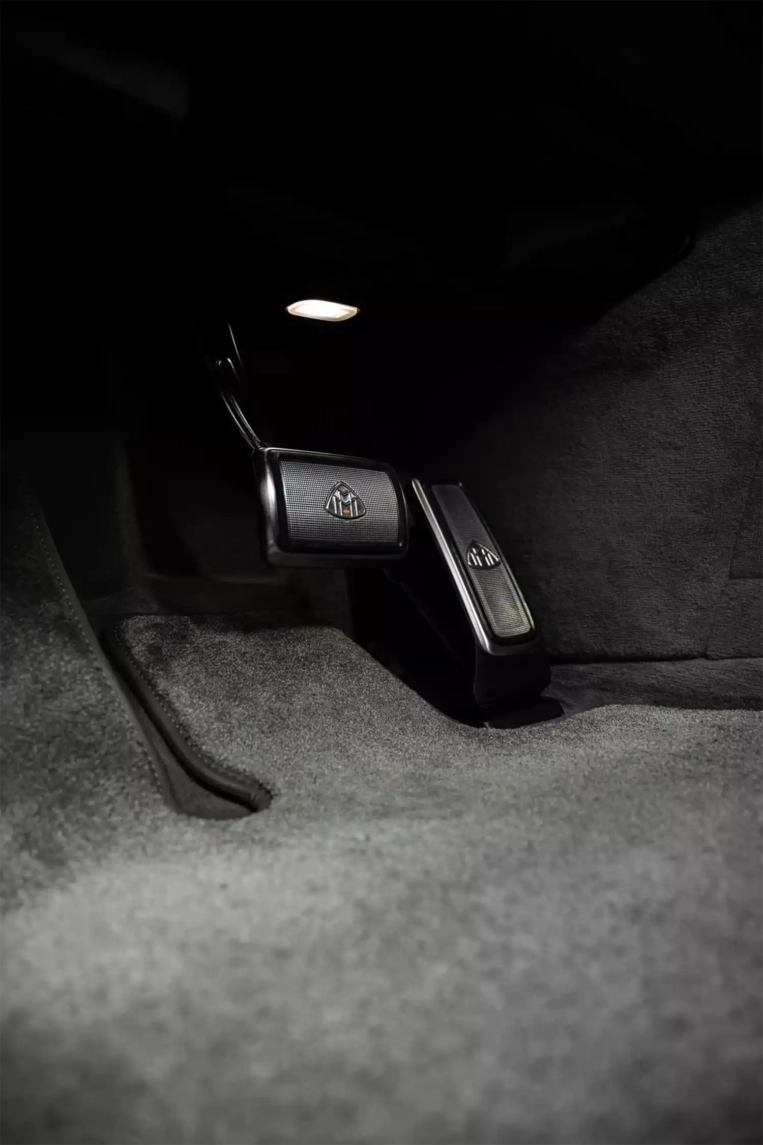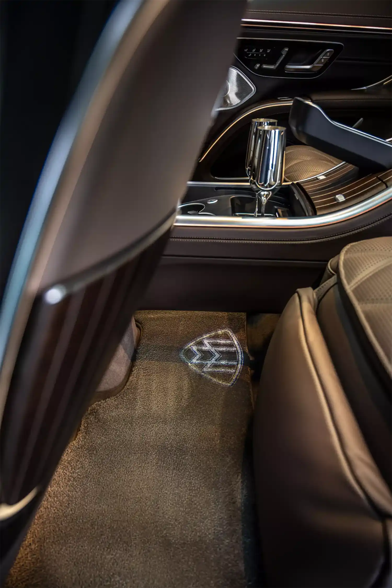 The Maybach emblem, which is integrated at various points as a design element, underscores the high-quality appearance that is typical of the brand. It adorns the stainless steel pedal system, the cushions on the headrests, the front seat backrests and, as a projection, the footwell in the rear. In conjunction with the first-class rear, it can also be found on the wood trim between the rear seats. When the trunk is open, it can also be seen on the inner lining of the tailgate. The brand lettering differentiates the steering wheel and welcomes all passengers on the stainless steel door sills in illuminated form.