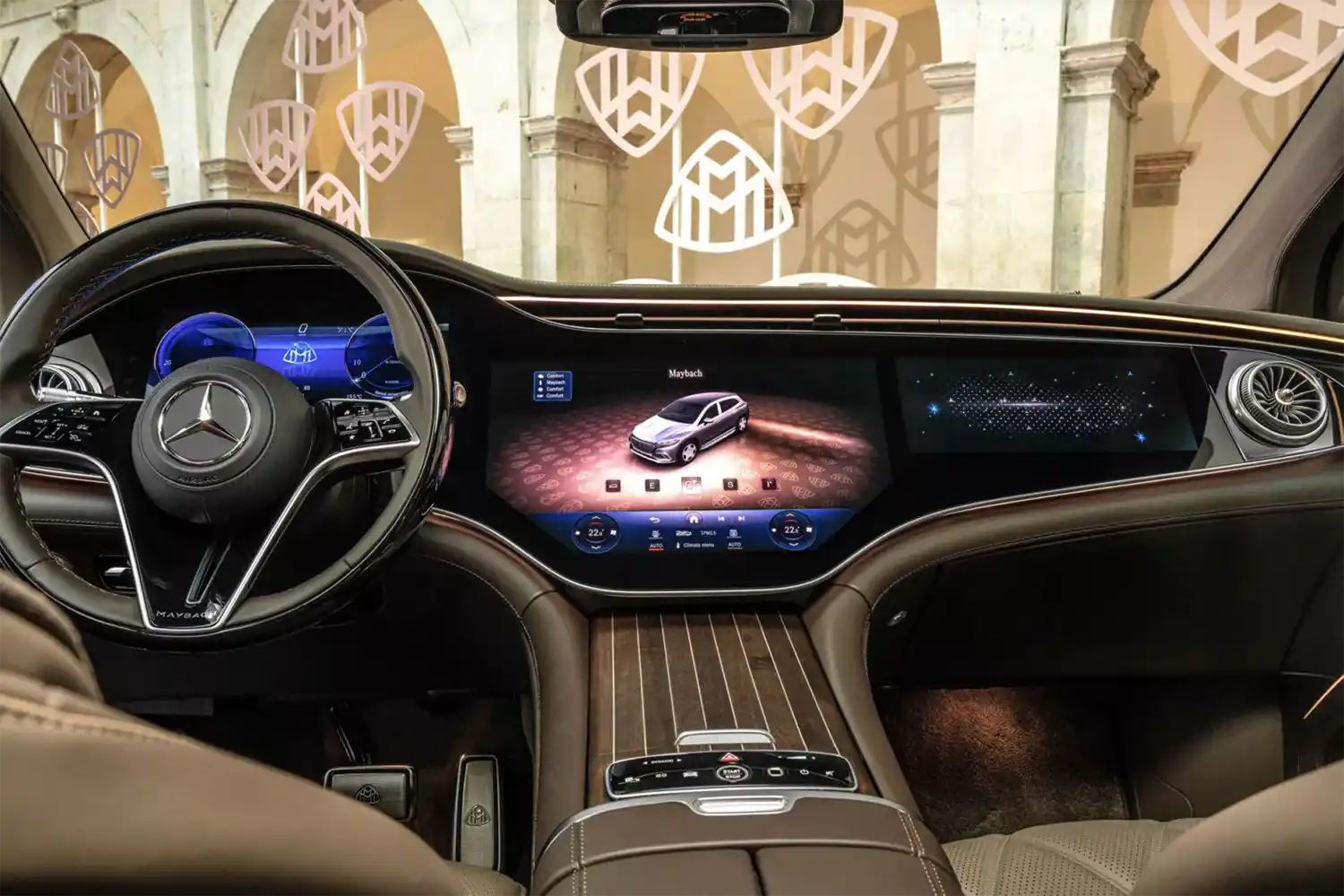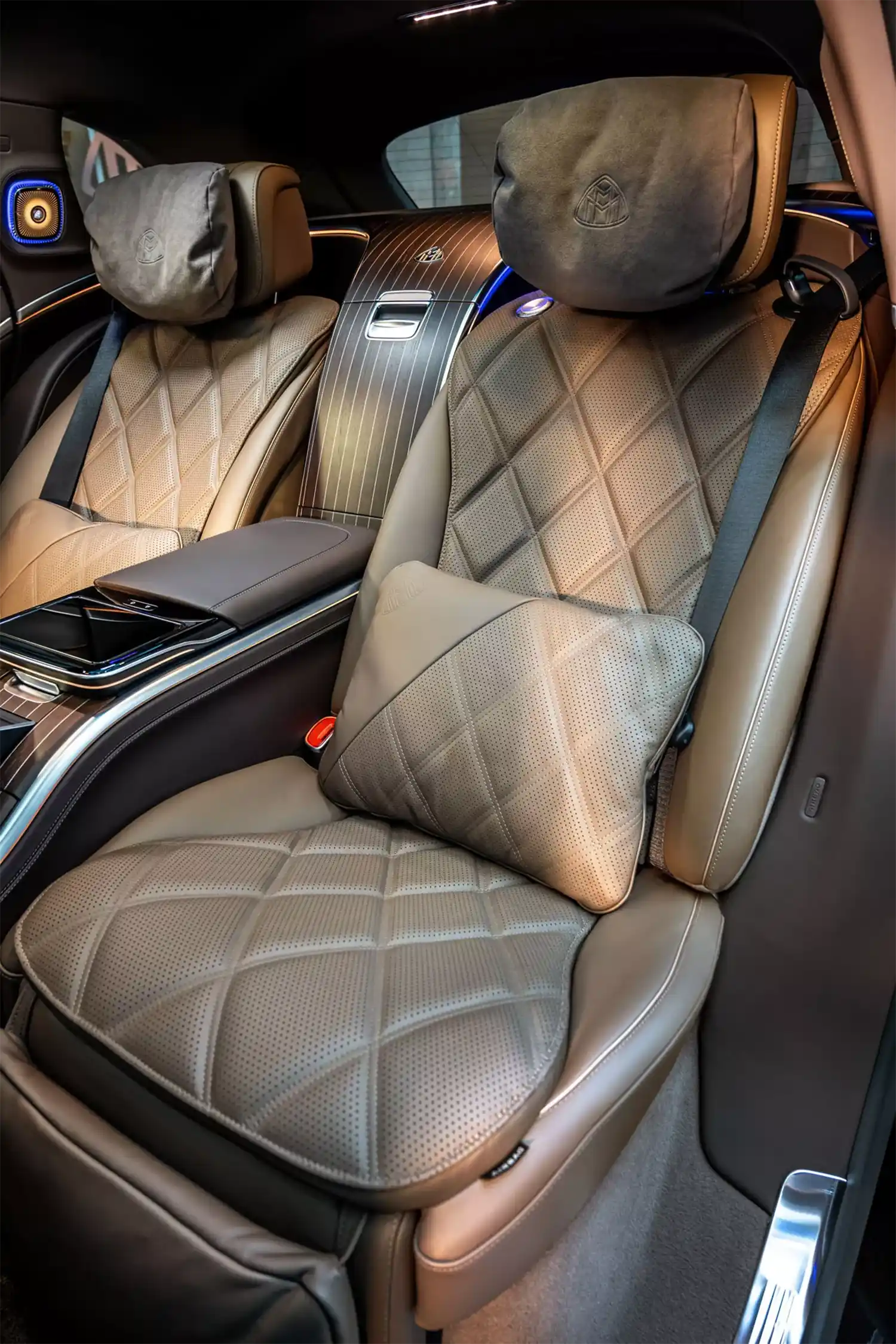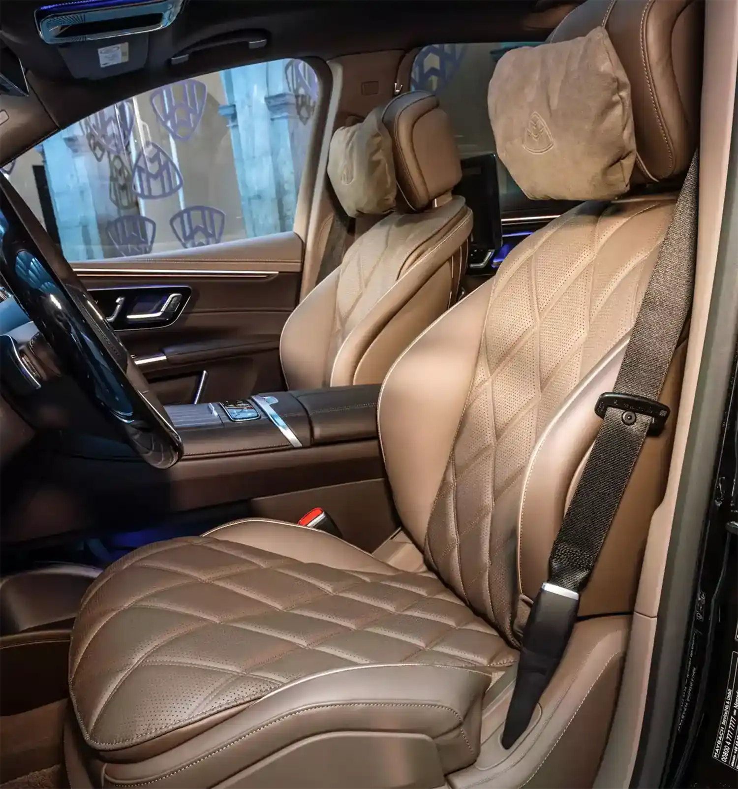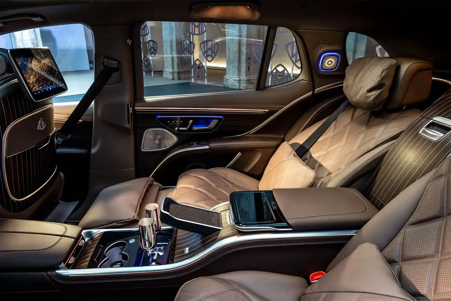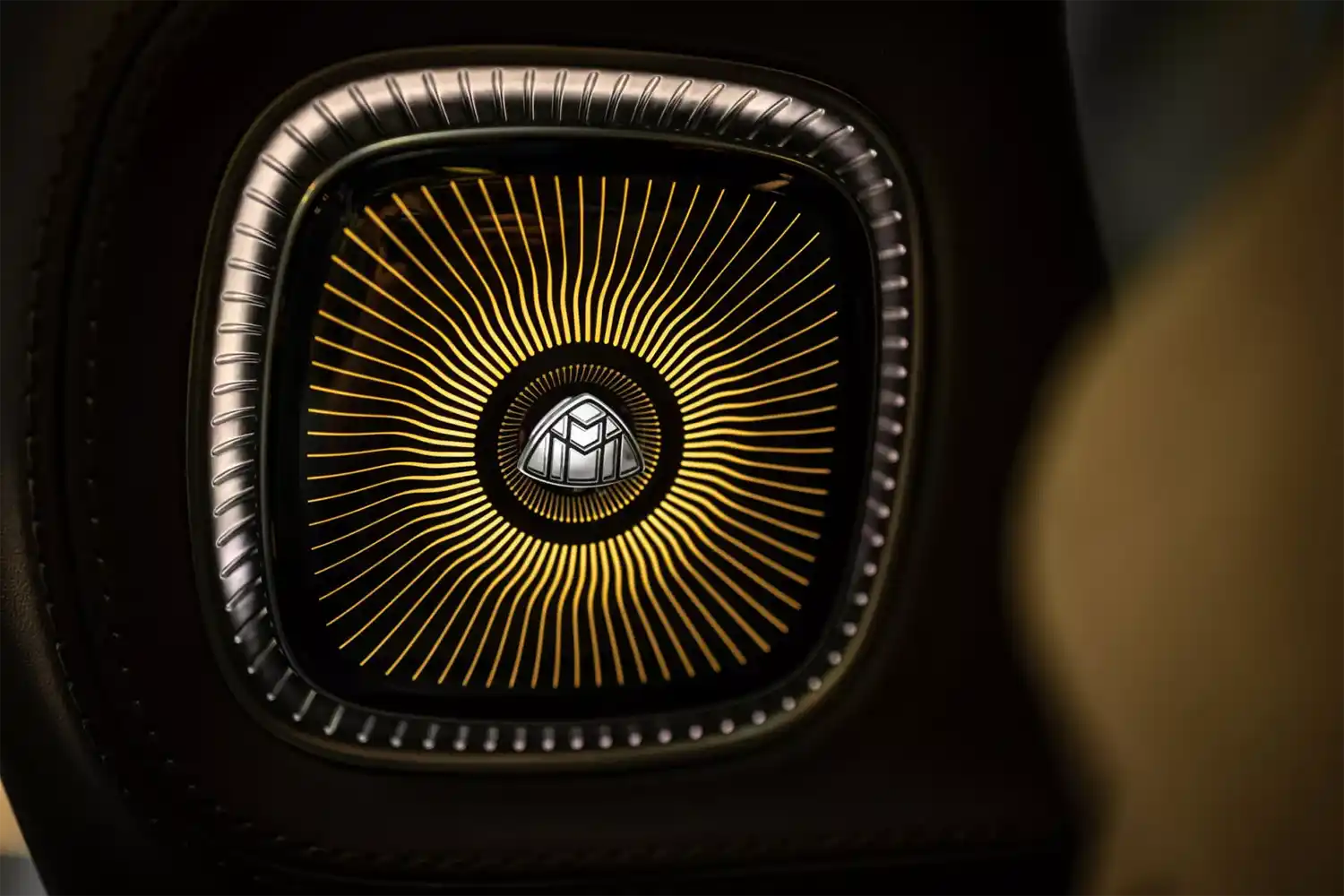 The Maybach emblem, which is integrated at various points as a design element, underscores the high-quality appearance that is typical of the brand. It adorns the stainless steel pedal system, the cushions on the headrests, the front seat backrests and, as a projection, the footwell in the rear. In conjunction with the first-class rear, it can also be found on the wood trim between the rear seats. When the trunk is open, it can also be seen on the inner lining of the tailgate. The brand lettering differentiates the steering wheel and welcomes all passengers on the stainless steel door sills in illuminated form.