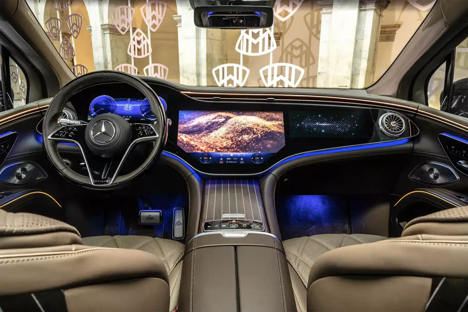 A designer lamp is integrated into each of the C-pillars. The adaptive rear lighting offers additional reading lights in the grab handles and light strips in the headlining. Both the brightness and the size and position of the light spots can be adjusted. At the same time, a wide range between precise work and relaxed lounge light is possible. The setting of the light colour automatically follows the human daily rhythm but can also be adjusted by hand. Added to this is the Ambient Lighting, which runs through the entire vehicle, right up to the roof liner and behind the rear seats. In addition, the Mercedes-Maybach EQS SUV contains Active Ambient Lighting with 253 individually controllable LEDs and 64 individually selectable colours. These include the Maybach-specific colour schemes of Rose Gold White and Amethyst Glow. The diverse options for individual lighting moods also underline the cocooning effect. The brand-typical “Welcome” presentation welcomes the passengers with a special light play: a carpet of light runs across the vehicle and particularly sets the scene for the rear doors.