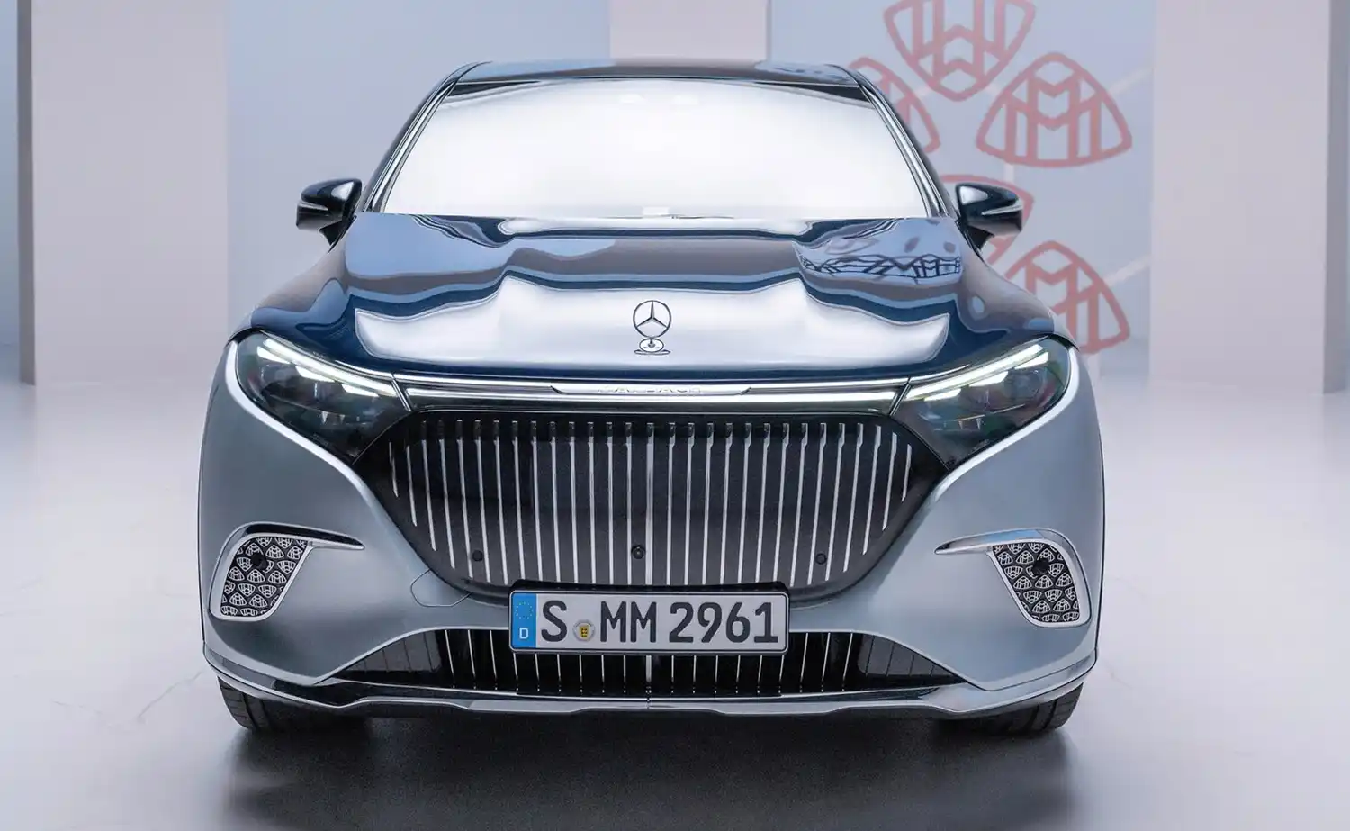 Mercedes-Maybach enriches the dynamic purpose design of the EQS SUV from Mercedes-EQ with exclusive elements that give it its very own character. The Mercedes star sits enthroned on the hood, defining the status. The front is characterised by the brand-typical black panel with vertical, chrome-plated trim strips in a three-dimensional depth look. The large black panel is smooth closed for the first time. The high-tech element for the radar sensors is fully integrated and no longer visible. Chrome-plated, filigree slats can also be found on the air intake of the bumper. The classic MAYBACH lettering is discreetly incorporated into a chrome-plated decorative strip, which forms a unit with the continuous light strip of the standard DIGITAL LIGHT headlights. The Maybach pattern with several small brand emblems can also be found in trim parts of the side bumper. DIGITAL LIGHT welcomes and says goodbye to the driver with a special light show. As a further greeting, an animated projection of the Maybach pattern shines in all four doors.