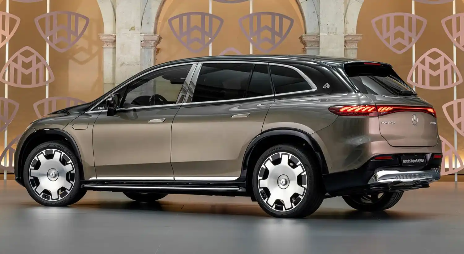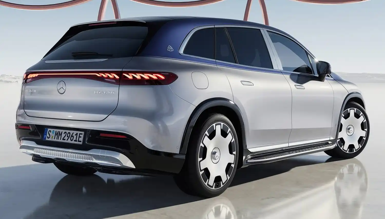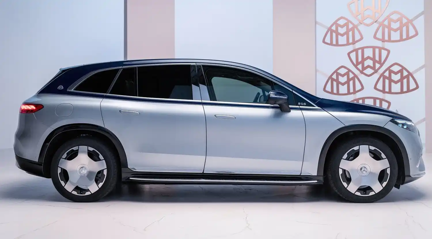 When viewed from the side, specific features include the bold chrome surrounds on the side windows and the chrome-plated B-pillar trim. This decorative element is an integral part of the Mercedes-Maybach signature and highlights the length of the rear seating area. A Maybach emblem on the D-pillar underlines the high quality. The lettering EQS is subtly integrated into the front window triangle. The pronounced wheel arches with claddings in high-gloss black emphasise the SUV’s power and emotional presence. Appropriately, the Mercedes-Maybach EQS SUV rolls on exclusive 21 or 22-inch alloy and forged wheels. The MAYBACH lettering can be found on the integrated, exquisitely designed wheel hub caps. Another eye-catcher are the standard running boards, which are illuminated in the dark. The treads are made of anodised aluminium, which echoes the pinstripe look of the black panel front. The Maybach emblem is also stylishly integrated here.