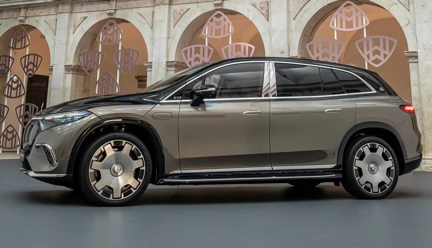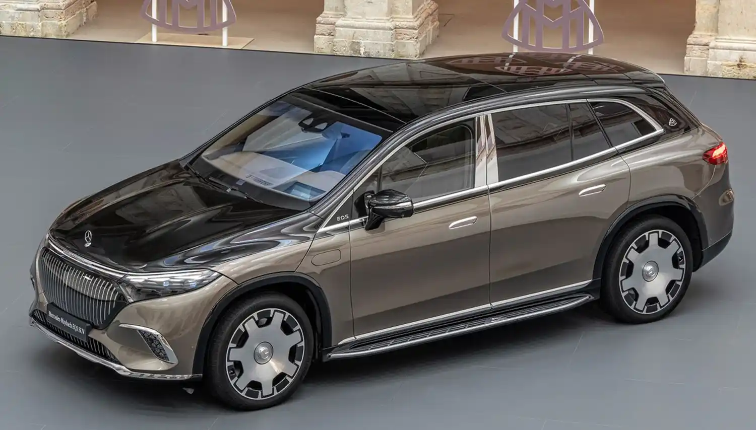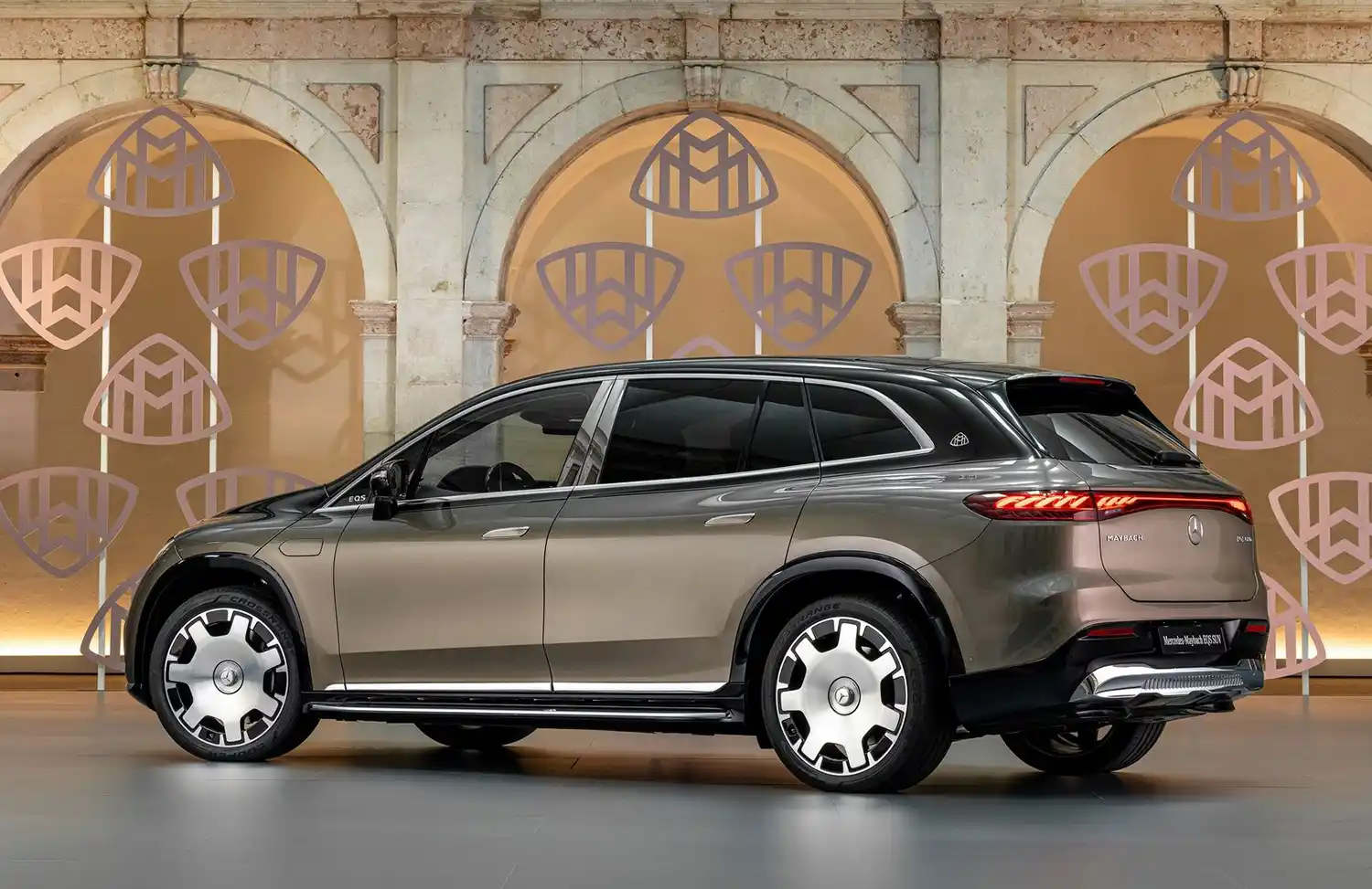 When viewed from the side, specific features include the bold chrome surrounds on the side windows and the chrome-plated B-pillar trim. This decorative element is an integral part of the Mercedes-Maybach signature and highlights the length of the rear seating area. A Maybach emblem on the D-pillar underlines the high quality. The lettering EQS is subtly integrated into the front window triangle. The pronounced wheel arches with claddings in high-gloss black emphasise the SUV’s power and emotional presence. Appropriately, the Mercedes-Maybach EQS SUV rolls on exclusive 21 or 22-inch alloy and forged wheels. The MAYBACH lettering can be found on the integrated, exquisitely designed wheel hub caps. Another eye-catcher are the standard running boards, which are illuminated in the dark. The treads are made of anodised aluminium, which echoes the pinstripe look of the black panel front. The Maybach emblem is also stylishly integrated here.