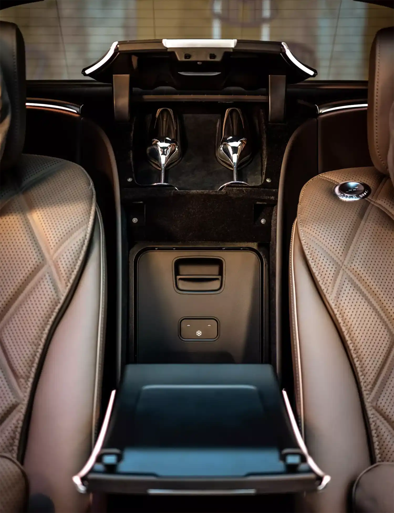 With the equipment First-Class Rear, the front centre console continues like a floating band to the rear seats. It was redesigned for the all-electric Mercedes-Maybach EQS SUV. Wooden trim adorns the rear storage compartment for the first time. It complements the wooden trim on the backs of the front seat backrests and between the rear seats, visually reinforcing the cocooning feel-good atmosphere. Also new is a projector in the centre console that discreetly projects the Maybach emblem onto the floor. As in the Mercedes-Maybach S-Class, the additional equipment includes two thermal cup holders and a shelf for the standard MBUX rear tablet. Four fast-charging USB-C ports and two HDMI interfaces also ensure that travellers can easily use their own digital devices. On request, the centre console can include two folding tables, a cooling compartment and silver-plated champagne goblets.