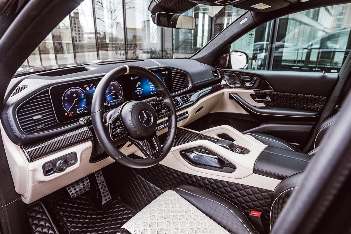 The BRABUS upholstery shop customized the interior of the high-performance luxury SUV with BRABUS MASTERPIECE appointments crafted from black and cream-colored leather.