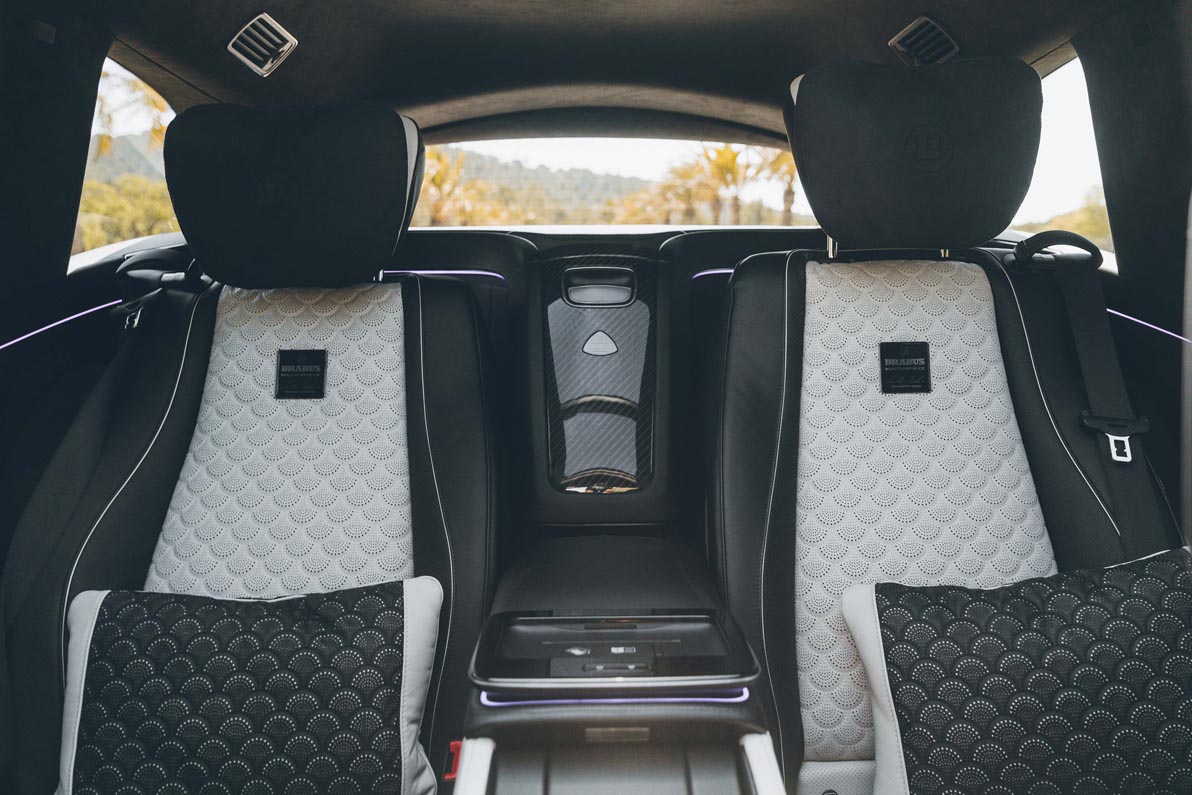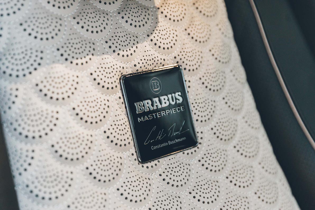 Another strong suit of BRABUS is making individual customer wishes in the vehicle interior come true. The experienced master upholsterers of the automotive refinement specialist created a particularly exclusive BRABUS MASTERPIECE two-tone interior for the BRABUS 900 featured here. They worked with especially soft and breathable black and cream-colored leather to provide contrast to the outer skin. The seat upholstery layout is characterized by shell-shaped quilting and perforations on the seat center sections applied with meticulous precision. The identical features are also found on the door panels. This design idiom continues in the vehicle flooring, the floor mats and the pillows in the rear. To increase the level of comfort in the rear even further, there are two particularly cozy pillows with Alcantara pillowcase and BRABUS logo attached to the head restraints of the rear seats.