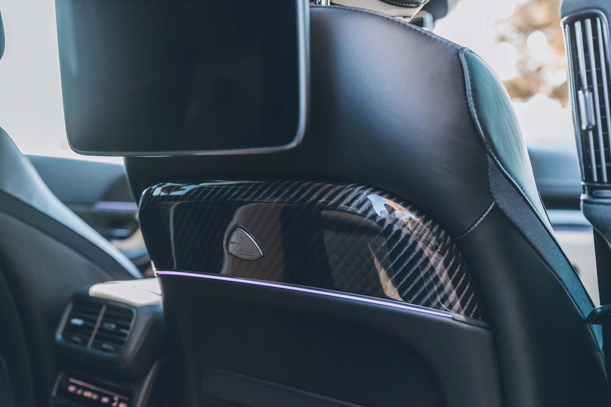 To add some decidedly sporty contrasts, the interior designers fitted this high-end SUV with aluminum pedals and BRABUS Signature carbon elements finished with high-gloss sealant on the steering wheel, dashboard, center console and door inlays. Stainless scuff plates with backlit BRABUS logo welcome driver and passengers. Like the plastic components in the interior, the scuff plates sport ‘Shadow Grey’ glazing.