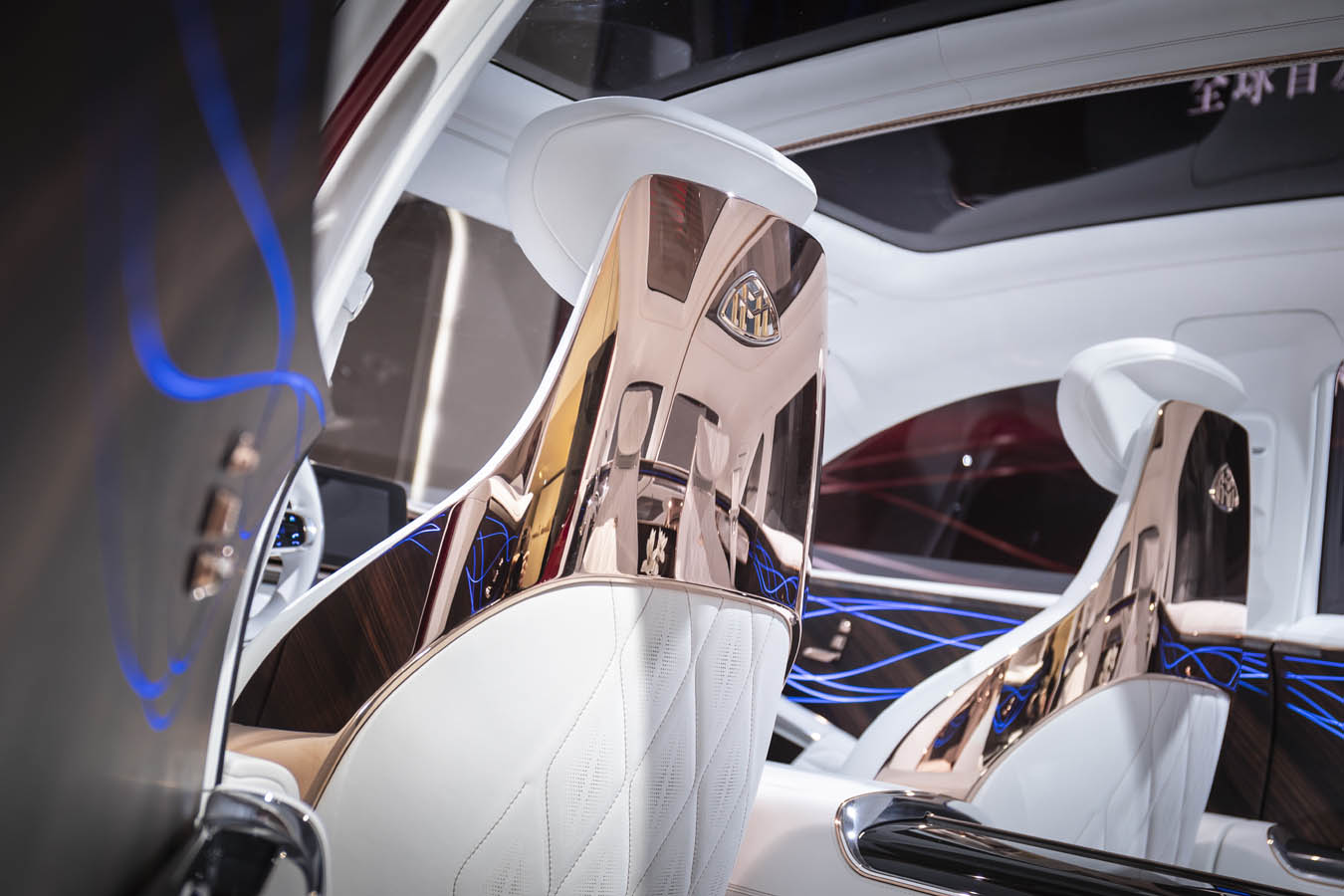 As in the Mercedes-Maybach S-Class, the especially comfortable seats impress with their adjustment kinematics. Unlike in a conventional saloon, the backrest is adjusted separately while the footwell and seat reference point remain unchanged. The cushion can be adjusted separately, while the seat angle and adjustment are combined. Extra-soft knee cushions afford protection and comfort. The reclining seats feature a calf support, which is freely adjustable for length and angle. The crystal white nappa leather seats are enhanced by diamond stitching in rosé gold.