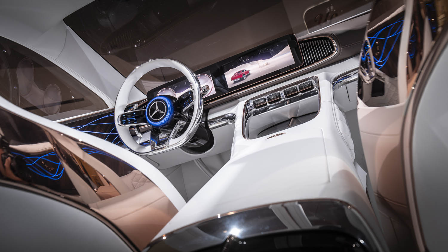 The highlight of the Mercedes-Benz user experience in the Vision Mercedes-Maybach Ultimate Luxury is the comprehensive touch control concept – a combination of touchscreen, touchpad on the centre console and Touch Control buttons in the steering wheel. Alongside the intuitive control experience, reduced driver distraction is a further advantage.