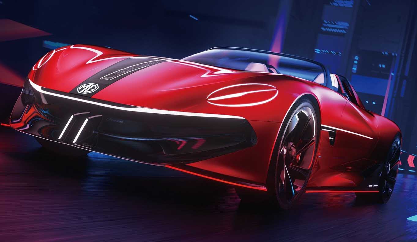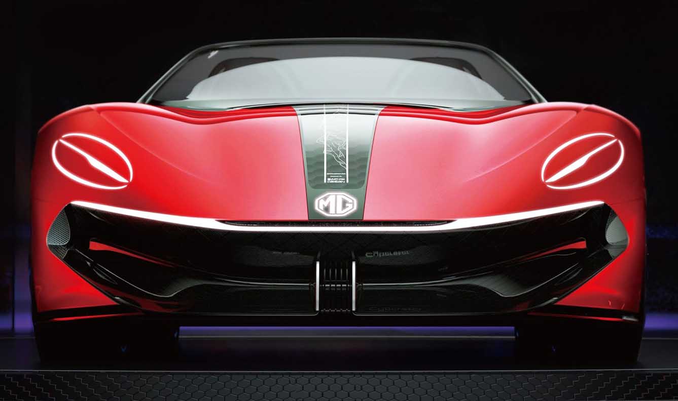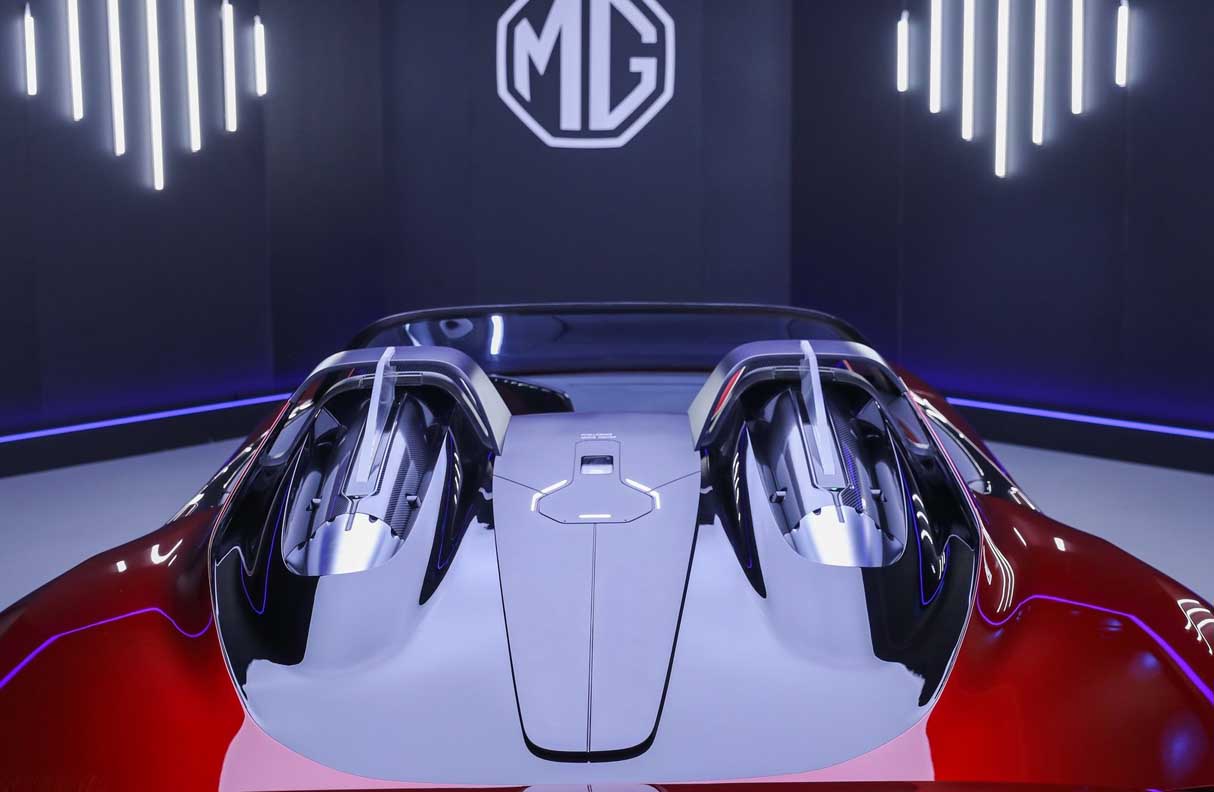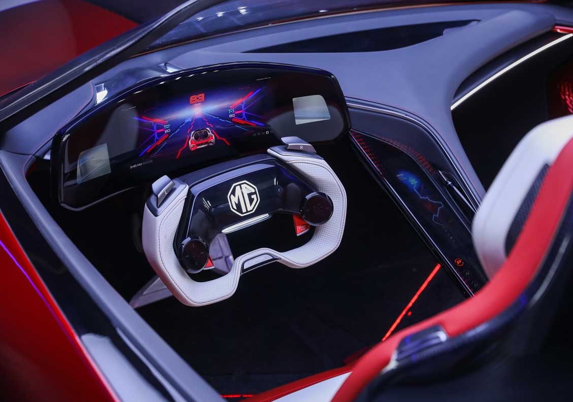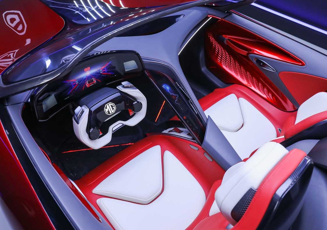 MG’s ‘Zero Gravity’ seats have floating head restraints, while the door panels and red leather handles reflect the ‘laser belt’ that runs down the car’s exterior.