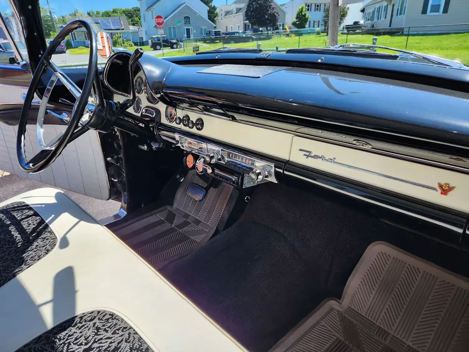 Under the hood, this 1956 Ford Fairlane Crown Victoria features a factory-correct 292 CI V-8 engine. It is equipped with a 4-barrel carburetor for optimal fuel delivery. Dual exhaust with Cherry Bomb mufflers provides a distinctive sound. Chrome air cleaner and valve covers enhance the engine bay’s appearance. A new radiator ensures efficient cooling. Power routes through a 3-speed Ford-O-Matic automatic transmission. A Ford 9-inch rear end with 3.00 gears optimizes performance. Recent replacements include a new master cylinder, battery, and starter.