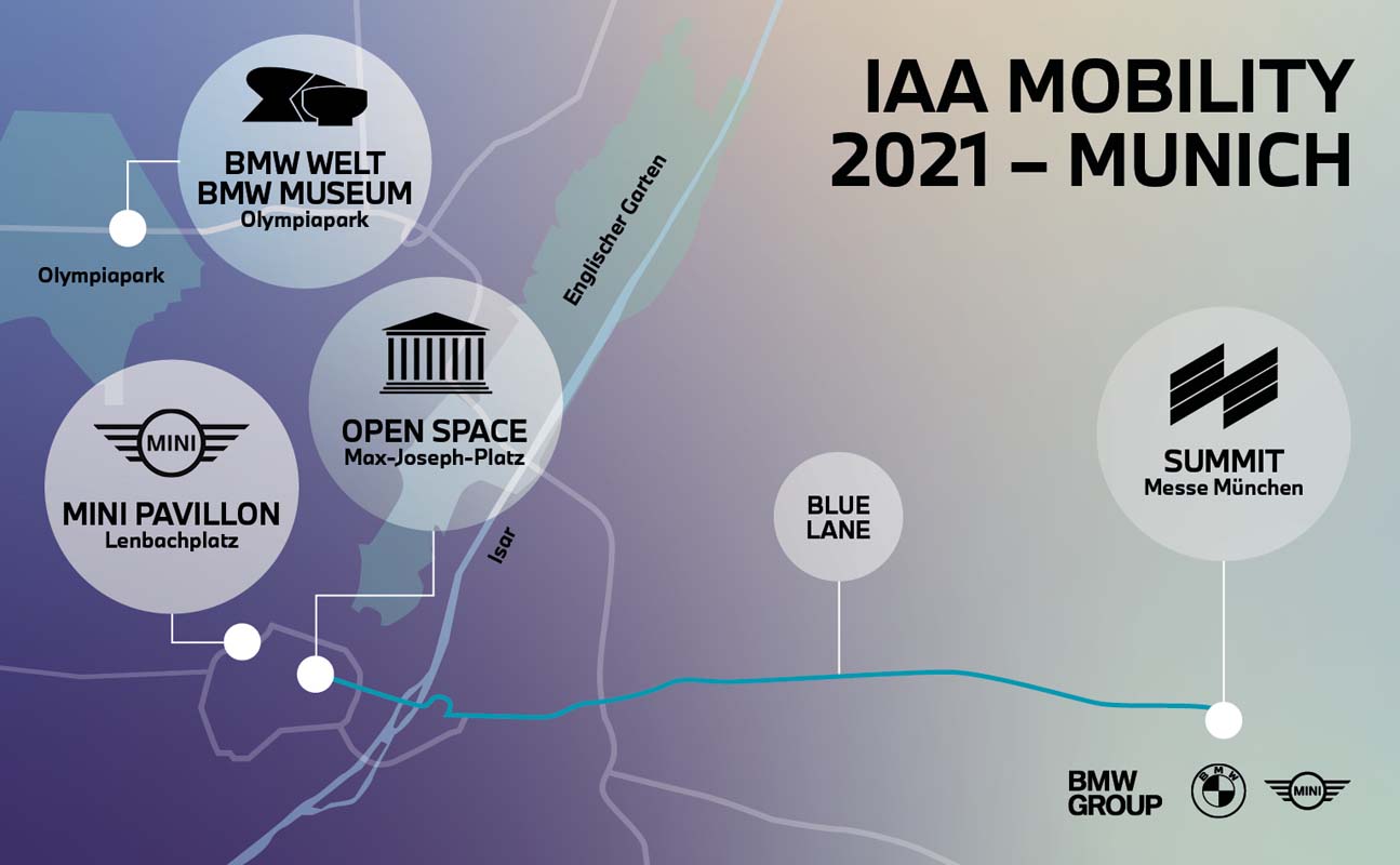 The various locations of IAA Mobility 2021 will be connected via the Blue Lane, which will run through the city area and offer visitors the opportunity to enjoy locally emission-free driving fun in the all-electric MINI Cooper SE (combined power consumption: 17.6 – 15.2 kWh/100 km according to WLTP, 16.9 – 14.9 kWh/100 km according to NEDC). An online streaming service will broadcast the highlights of IAA Mobility 2021 digitally to the entire world, either live or as a recording.