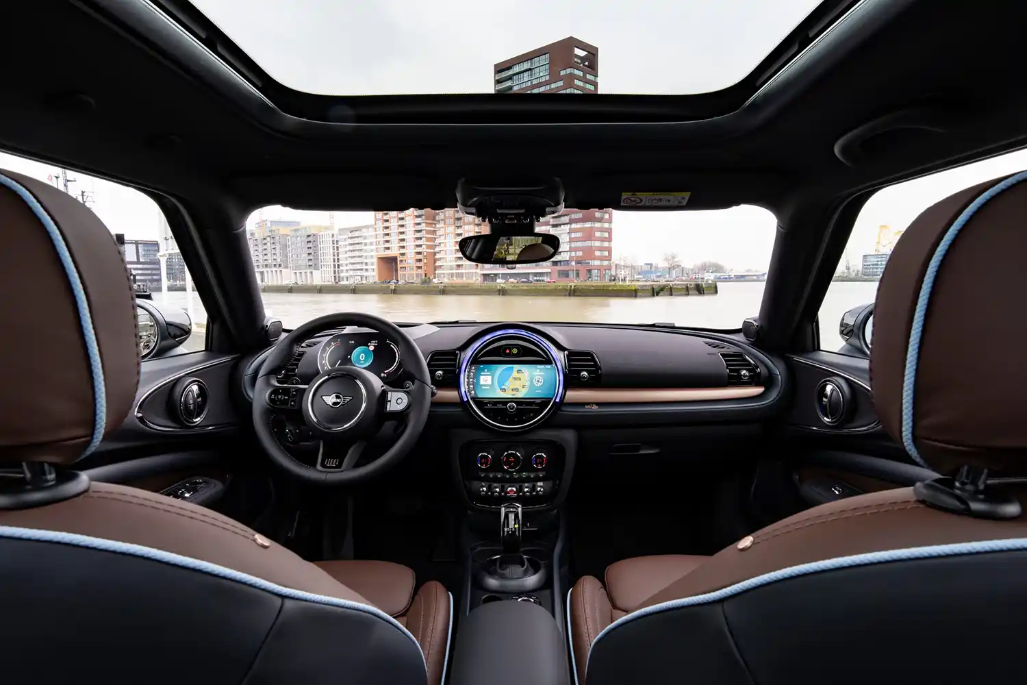 The interior of the MINI Clubman Final Edition emphasizes the exclusive aura of the limited special edition with numerous equipment details. For example, the door sill trims with the edition-specific “Final Edition” lettering, which is also found on the lower spoke of the comfortable sports leather steering wheel in Nappa, already create a special ambience in the edition model. The comfortable MINI Yours leather sports seats with adjustable thigh support and sewn-in edition badge are finished in Dark Maroon. They are stylishly set off by an anthracite-coloured Piquet fabric insert and blue contrasting stitching.