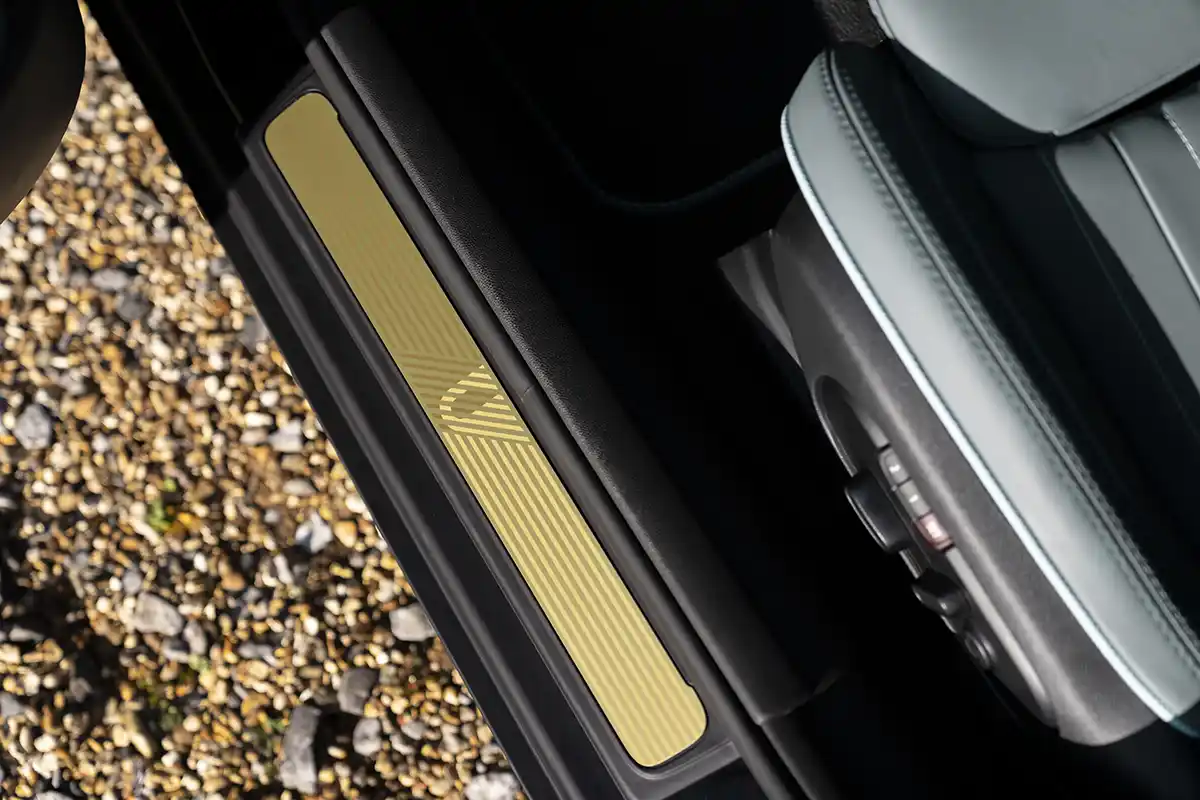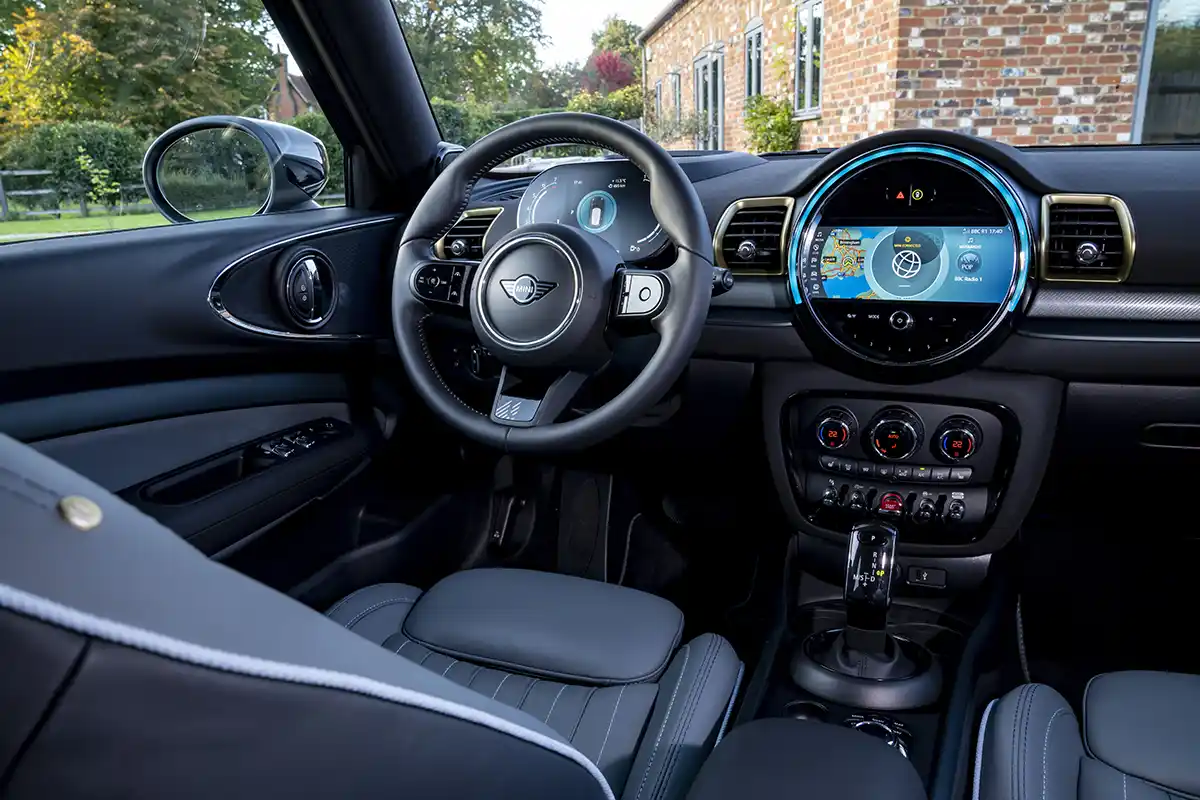 The black sports seats in the MINI Yours Leather Lounge Carbon Black version transfer the confident aura of the exterior to the interior. Illuminated accent strips and exclusively designed interior surfaces with a discreet striped pattern, combined with the surrounds of the air vents reminiscent of refined brass, set noble accents.