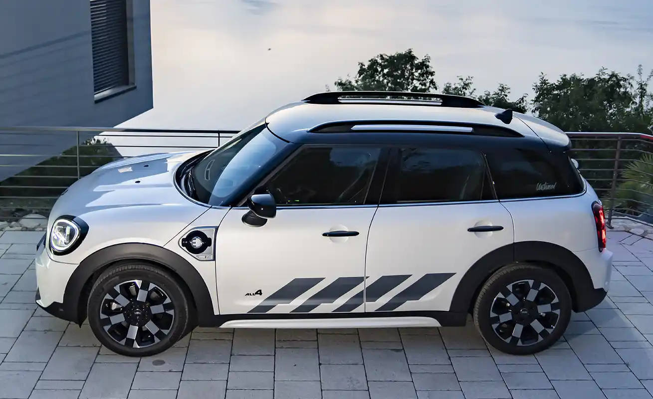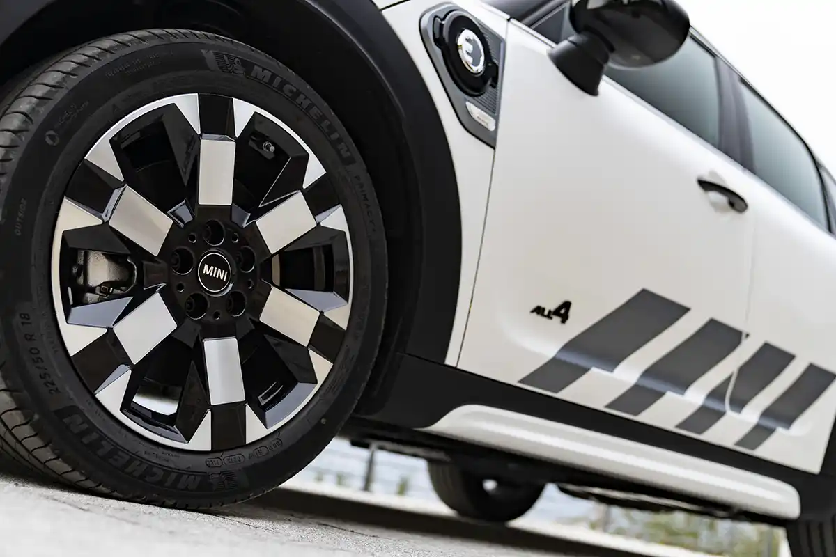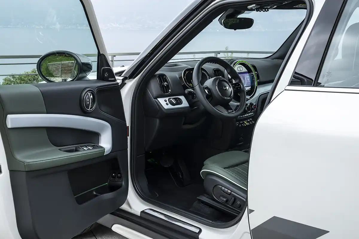 The special edition highlights the robust design of the MINI ALL4 exterior look with the new Nanuq White paint finish and underlines the sporty character of the MINI Cooper SE Countryman ALL4. The body finish appears on the lower air intake surround including the suggested underride guard, the air curtain inserts in the front apron and the side sills, as well as on the reflector inserts and the lower insert in the rear apron.