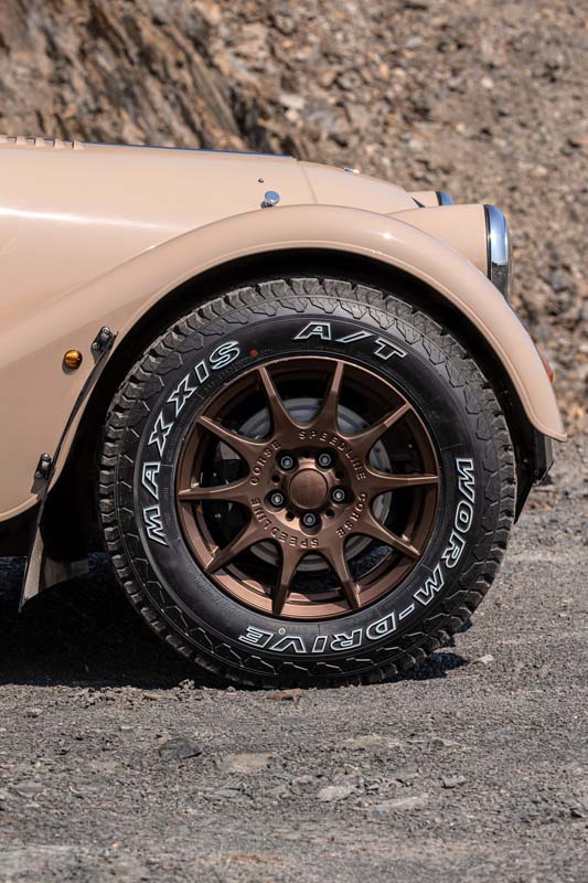 In addition to the main suspension hardware, the lower suspension arms contain bespoke bushes which further increase durability. The combined suspension package is optimised to undertake journeys never before attempted in a Morgan sports car, while ensuring composure and comfort during any excursion into the back country.