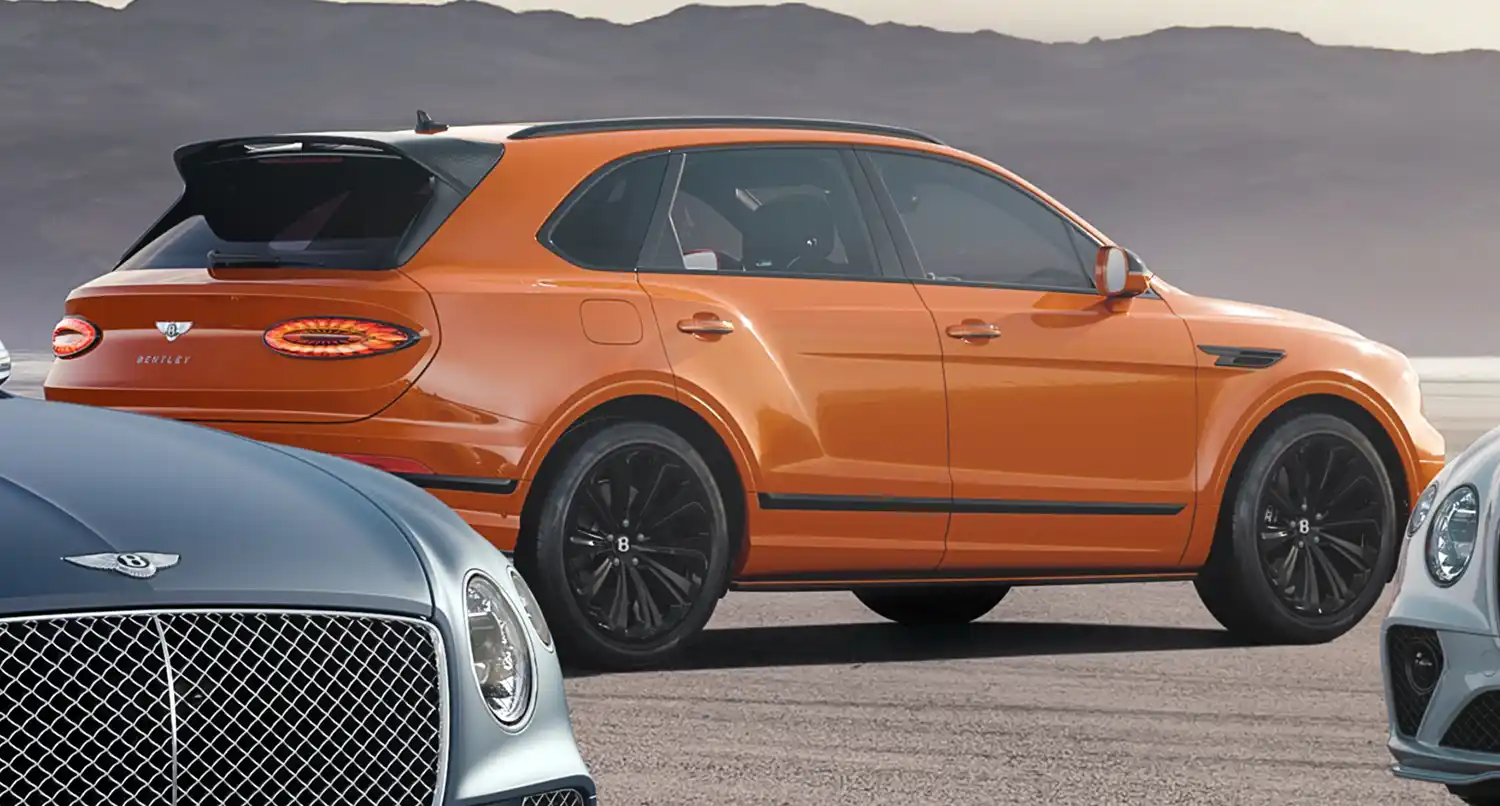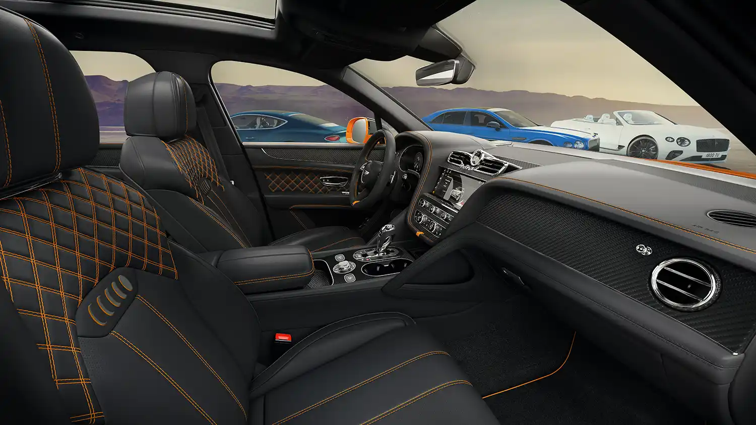 Exterior colour schemes include a Bentayga Azure in Titan Grey with Blackline Specification and Mandarin pinstripe on the Styling Specification body kit. Its interior maintains the low-key mood with satin carbon fibre to all veneered surfaces and upholstery in Beluga. A flash of brilliance is provided by the contrast stitching in Mandarin, which is used for the diamond quilting on seat uppers and door inserts. Mandarin is also employed as an accent colour on the steering wheel 6 o’clock tab and console.