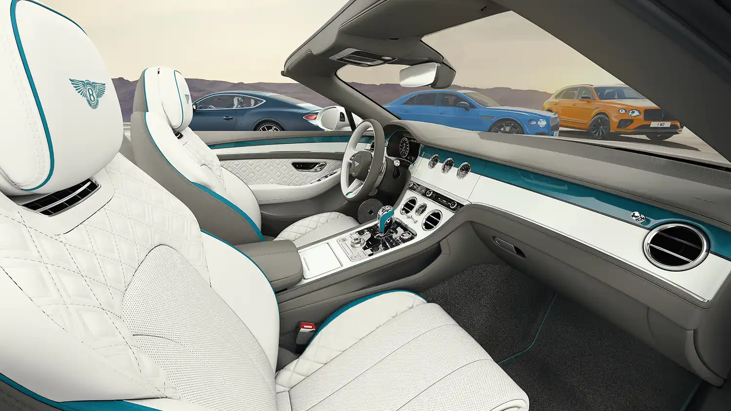 On entering the cockpit, the main and secondary hide colours of Arctic and Porpoise are enlivened by an accent hide in Dragonfly, creating a bespoke colour split. The dual veneer fascia and waist rails are in high gloss Piano Dragonfly over Piano Arctica white, matched to the hide colours. A fine Beluga painted pinstripe separates the two Piano veneers. Finishing touches include embroidered Bentley emblems on each seat headrest in Dragonfly and bespoke Naples Arctica Collection treadplates.