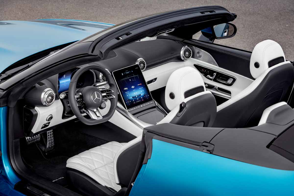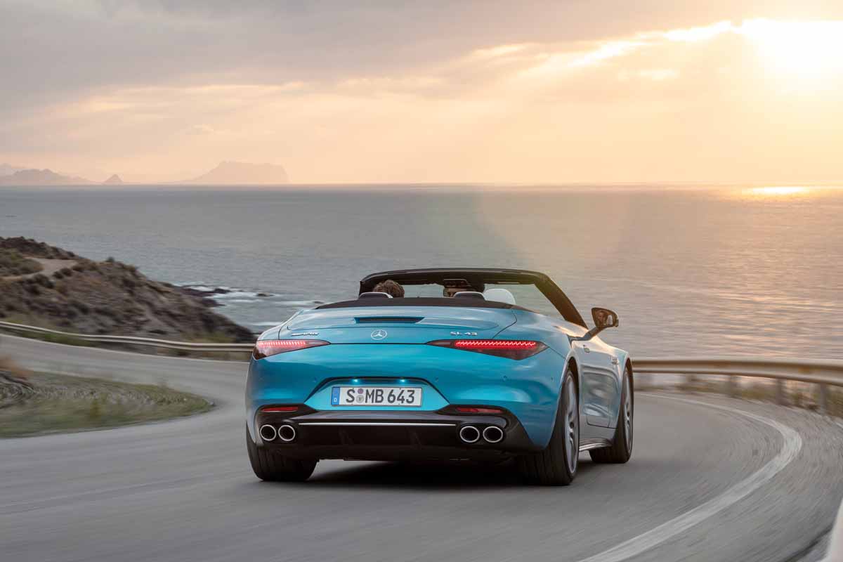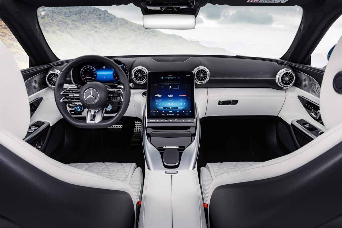 With the new Mercedes-AMG SL 43 (combined fuel consumption 9.4–8.9 l/100 km, combined CO2 emissions 214–201 g/km) [1], entry into the iconic world of the sporty roadster is possible from just 118,708.45 euros[2]. This is the base price for the 2+2-seater with agile rear-wheel drive, which is now available to order. The extensive standard equipment includes the electrically operated multilayer fabric soft top, 19‑inch AMG alloy wheels, DIGITAL LIGHT, the AMG high-performance composite braking system and the AIRPANEL active air control system. Added to this are the active rear spoiler, the “hyperanalogue” cockpit with MBUX infotainment system and tilt-adjustable multimedia touchscreen, as well as comfort seats with ARTICO man-made leather and fabric. The numerous options allow for a wide range of possibilities for individualisation. The AMG 2.0-litre four-cylinder engine develops 280 kW (381 hp) and provides a maximum torque of 480 Nm. An electric exhaust gas turbocharger is being used here in a production vehicle for the first time anywhere in the world. This technology originated in Formula 1™ and guarantees particularly spontaneous responsiveness across the entire rev range. The turbocharger is powered by the 48-volt on-board electrical system, which also feeds the belt-driven starter generator (RSG) that provides an additional boost of 10 kW (14 hp) for a short time. Accelerating from 0 to 100 km/h takes just 4.9 seconds, while the top speed is limited to 275 km/h.