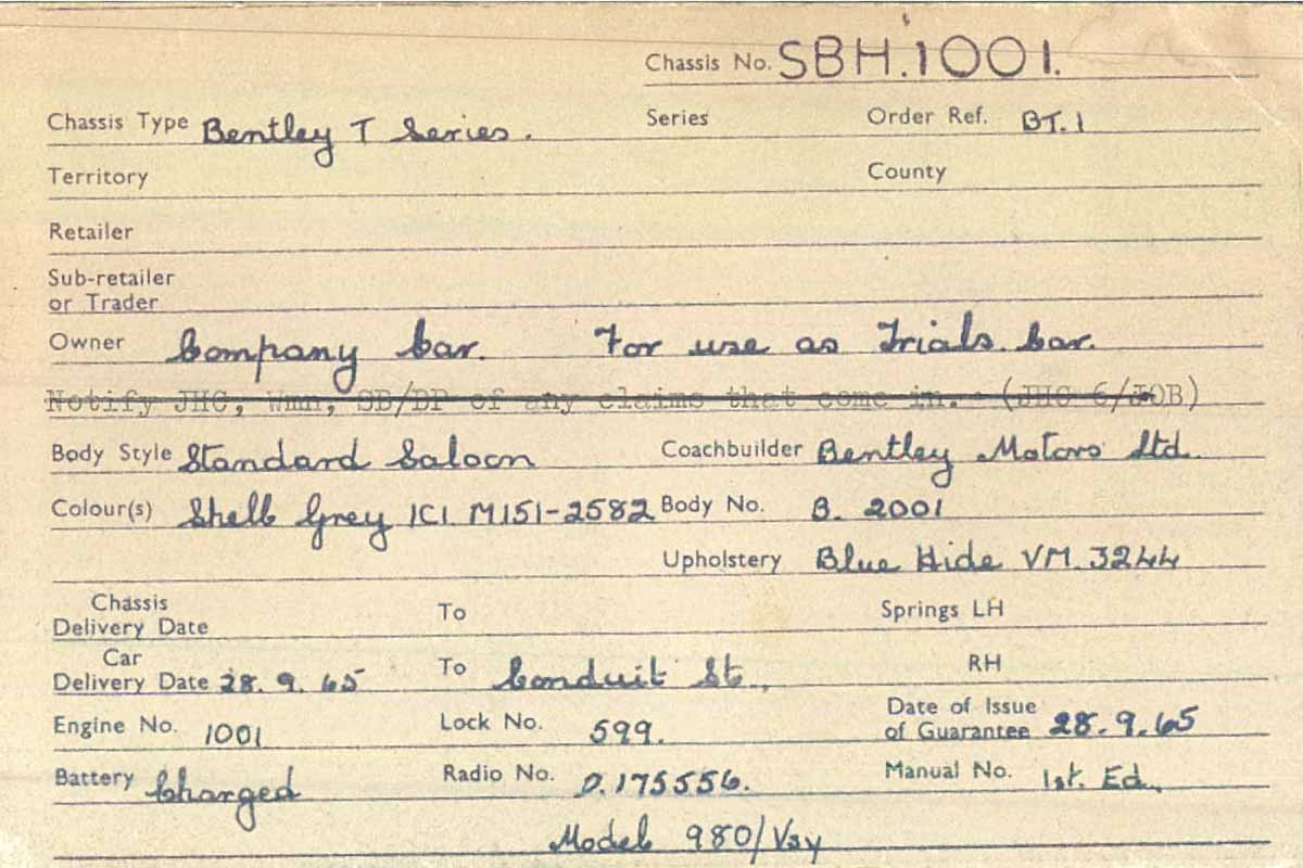 The oldest T-Series completed manufacture on the 28 September 1965. Owned by Bentley Motors and destined for trials work around the world, the T-Series was finished in Shell Grey exterior paint and complemented with a Blue Leather interior.