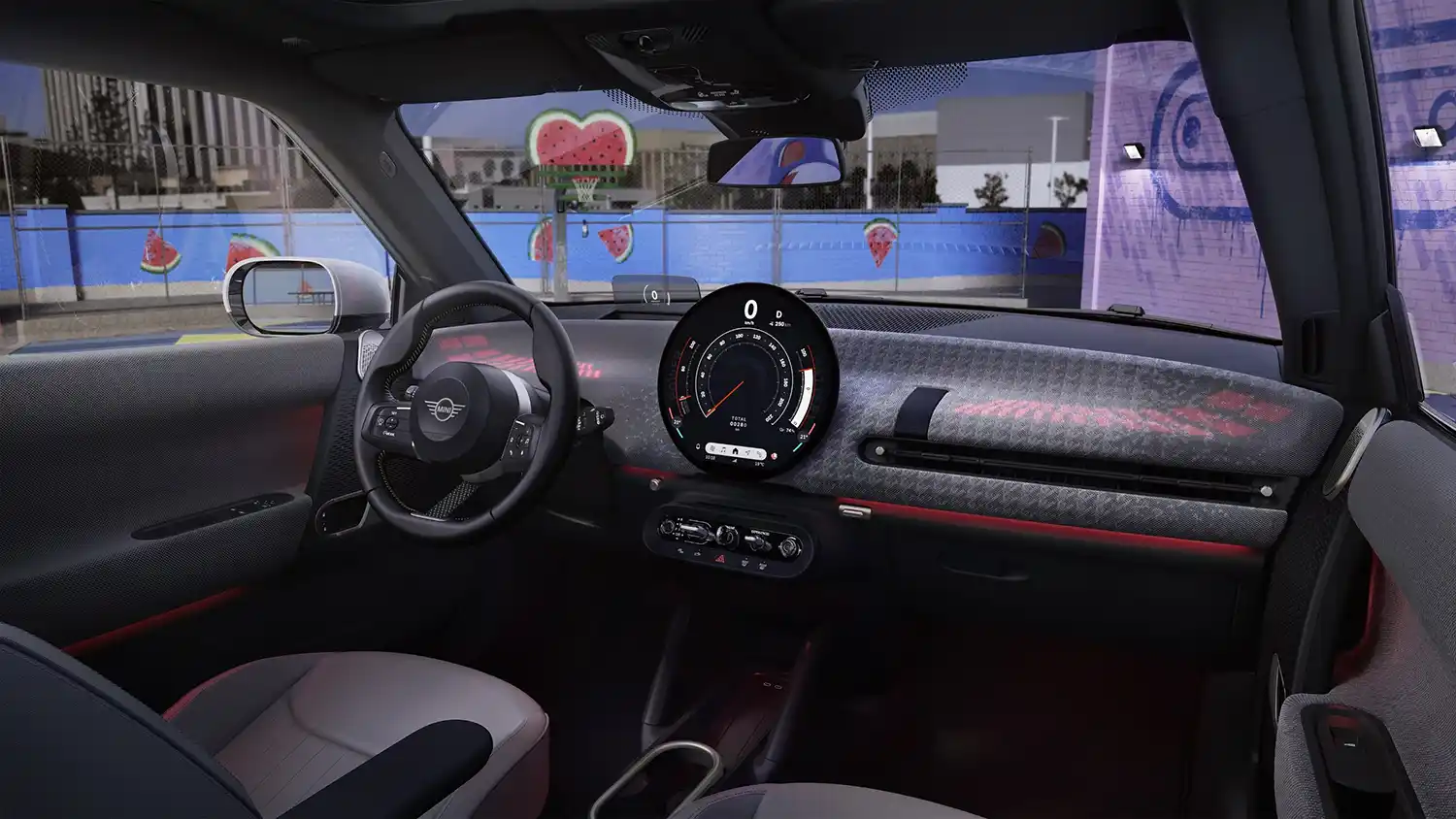 - Go-Kart: Ultra-dynamic and brimming with motor sport DNA, Go-Kart Mode cloaks the display and the interior as a whole in the colour shades Anthracite and Red. The MINI Interaction Unit adopts a sporty speedometer – if the driver wishes, across its full surface area. The projection and ambient lighting are adjusted automatically to the Go-Kart colours. The dashboard is draped in the projection pattern of Go-Kart Mode, and the throttle response of the accelerator pedal is optimised for dynamic driving. The Go-Kart driving sound – intended to raise the sporty driving experience another notch – is marked out by strongly pronounced pitch and fall, and as such provides a fitting soundscape for agile and dynamic driving.