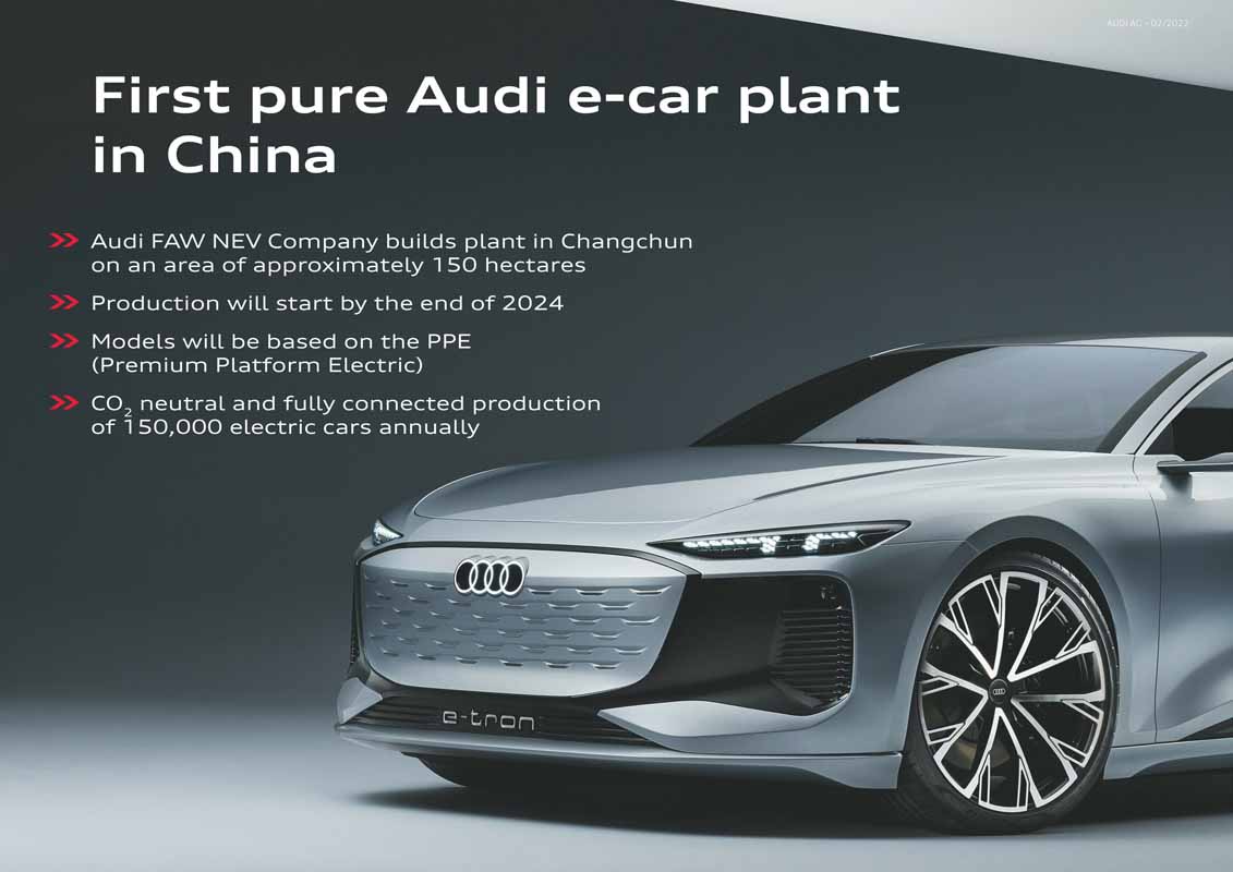 Audi is consistently focusing on the electrification of its model range in China as well. With the Audi-FAW NEV Company Ltd., Audi is setting the course for expanding the local e-product portfolio, building a new plant for fully electric Audi models using the Premium Platform Electric (PPE).