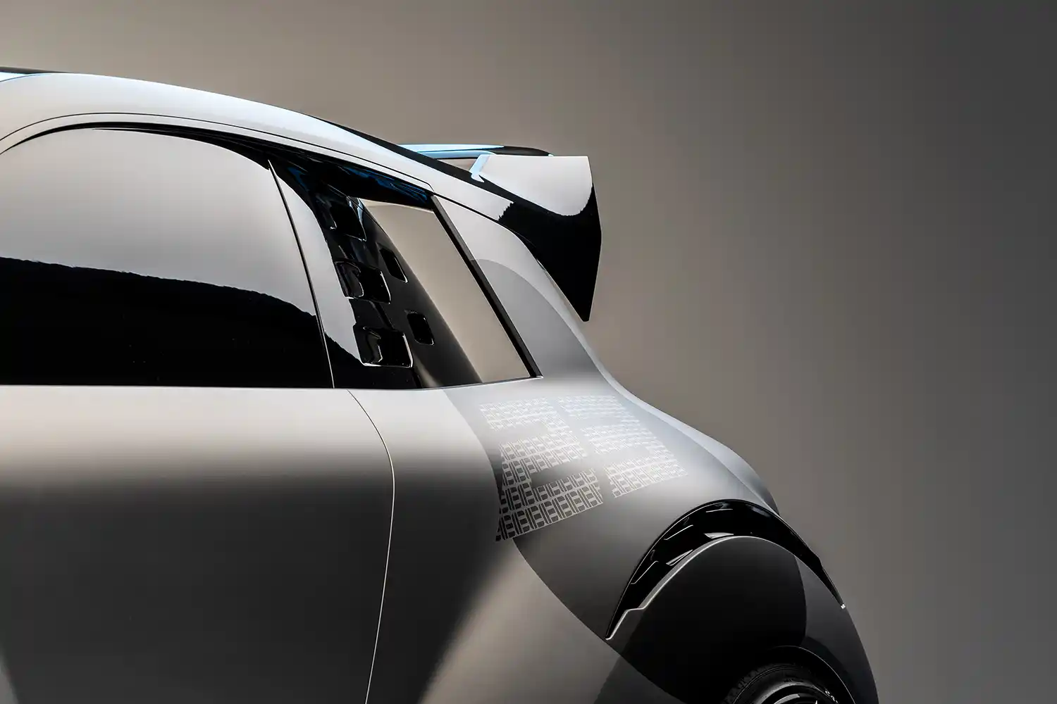 Like the front, each of the rear lights consist of a thin upper and lower semi-circle LED which contrast with the squared off forms of the lower portion which is defined by fiercely functional shapes to manage the airflow and to maximise the creation of downforce as the air escapes from under the car. The full width of the car is emphasised by a horizontal bar below what looks like a soft smile that defines the outline of rear hatchback.