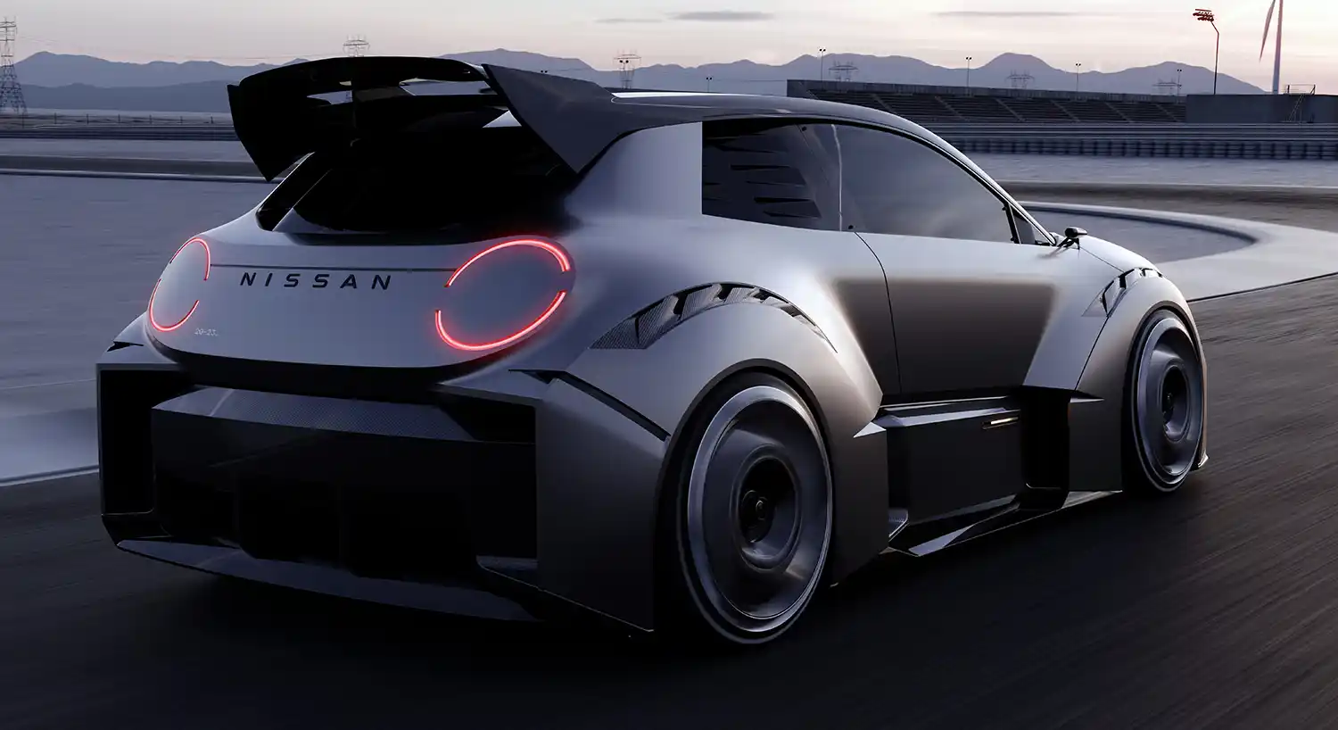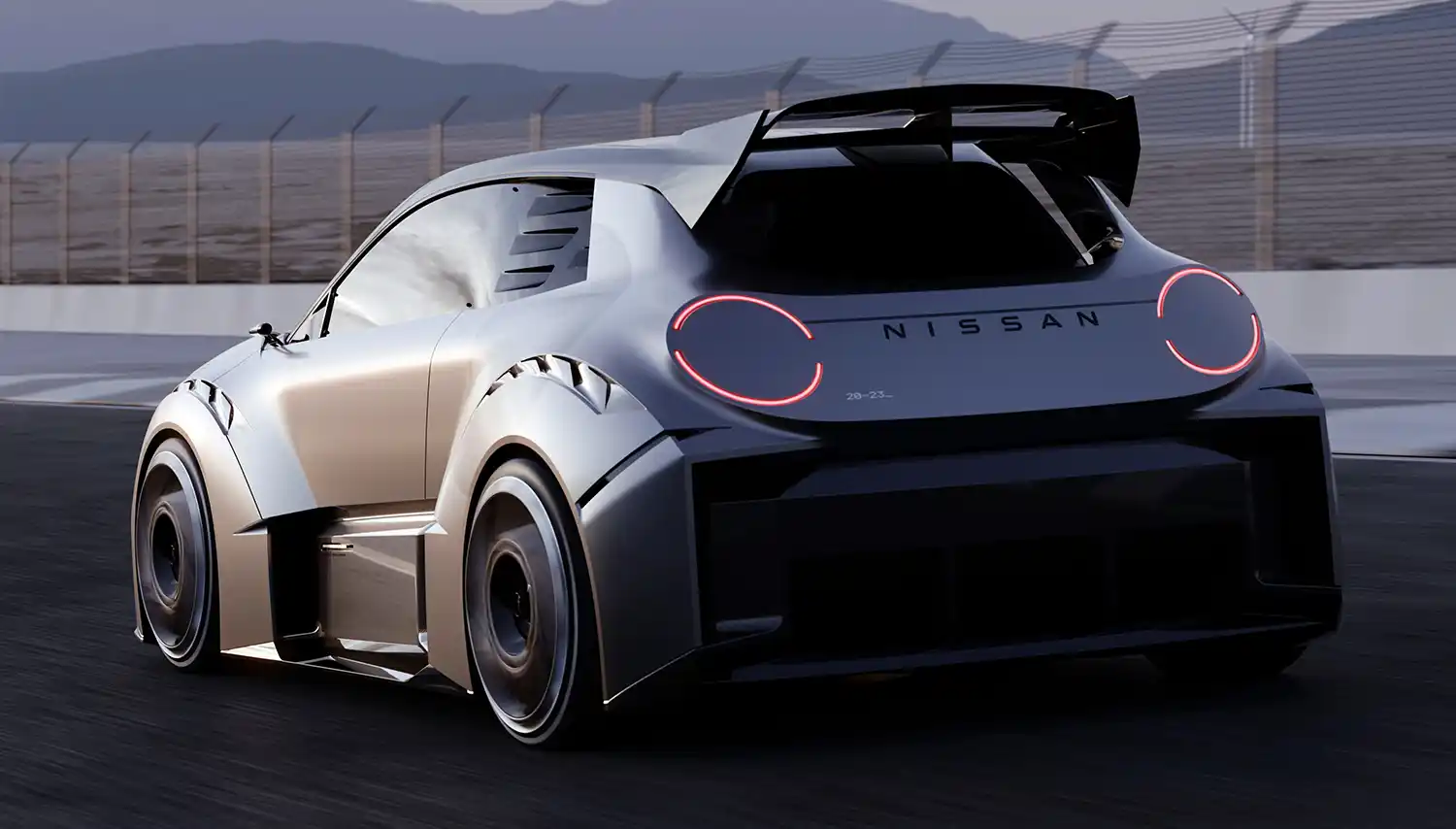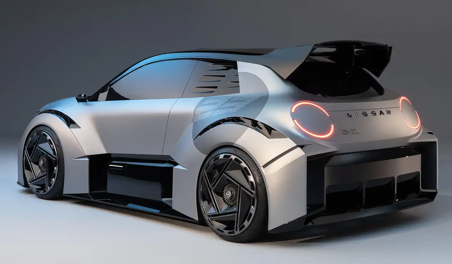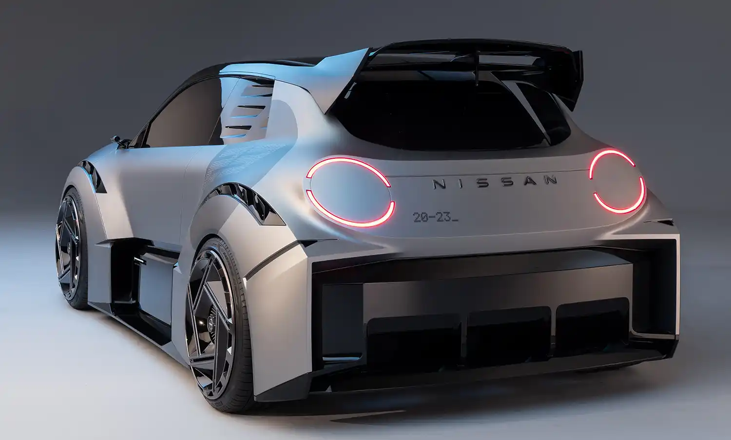 The modern twist on this small car playfulness reflects both the world of online racing and Nissan’s participation in Formula E. The Concept 20-23’s basic 3-door hatchback body-style features extreme aerodynamic addenda front and rear, with deep skirts which direct the airflow away from the front of the car, through apertures to cool the brakes and out through vents just behind the front wheels.