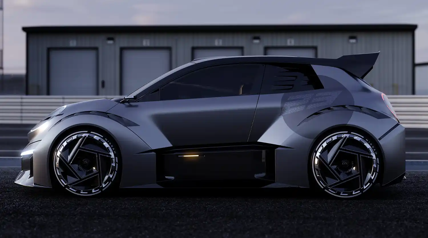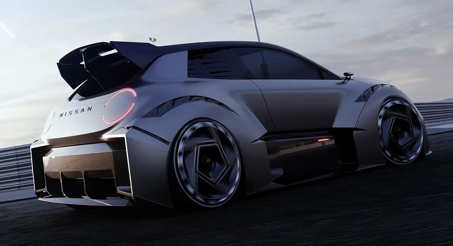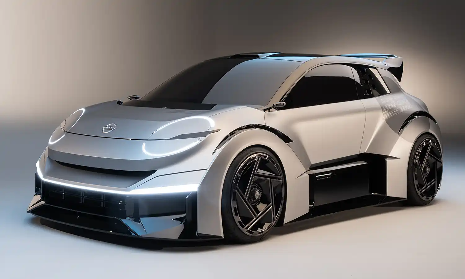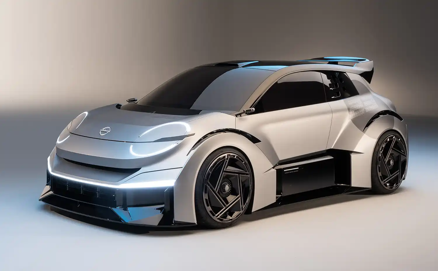 The modern twist on this small car playfulness reflects both the world of online racing and Nissan’s participation in Formula E. The Concept 20-23’s basic 3-door hatchback body-style features extreme aerodynamic addenda front and rear, with deep skirts which direct the airflow away from the front of the car, through apertures to cool the brakes and out through vents just behind the front wheels.