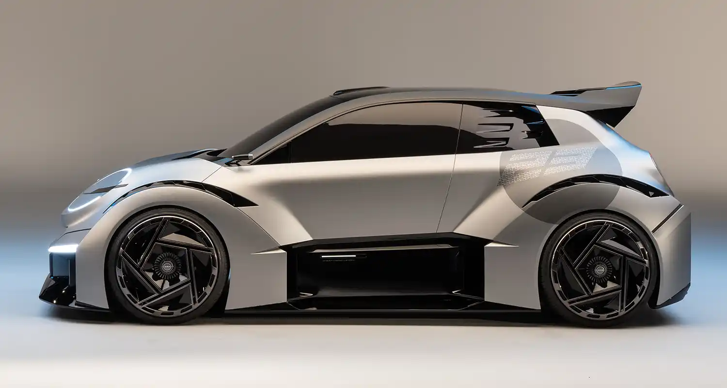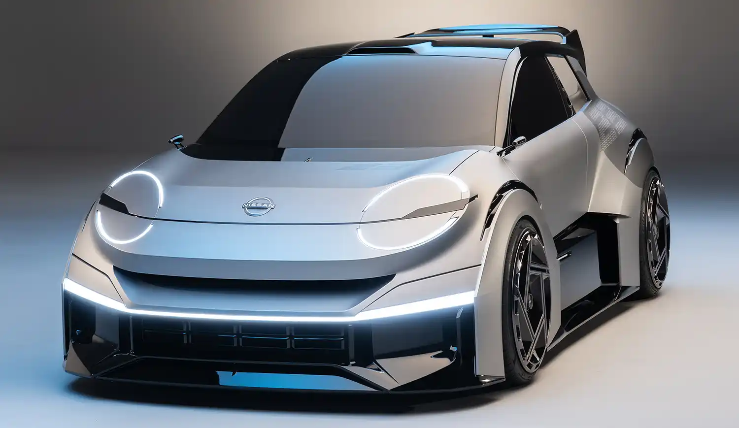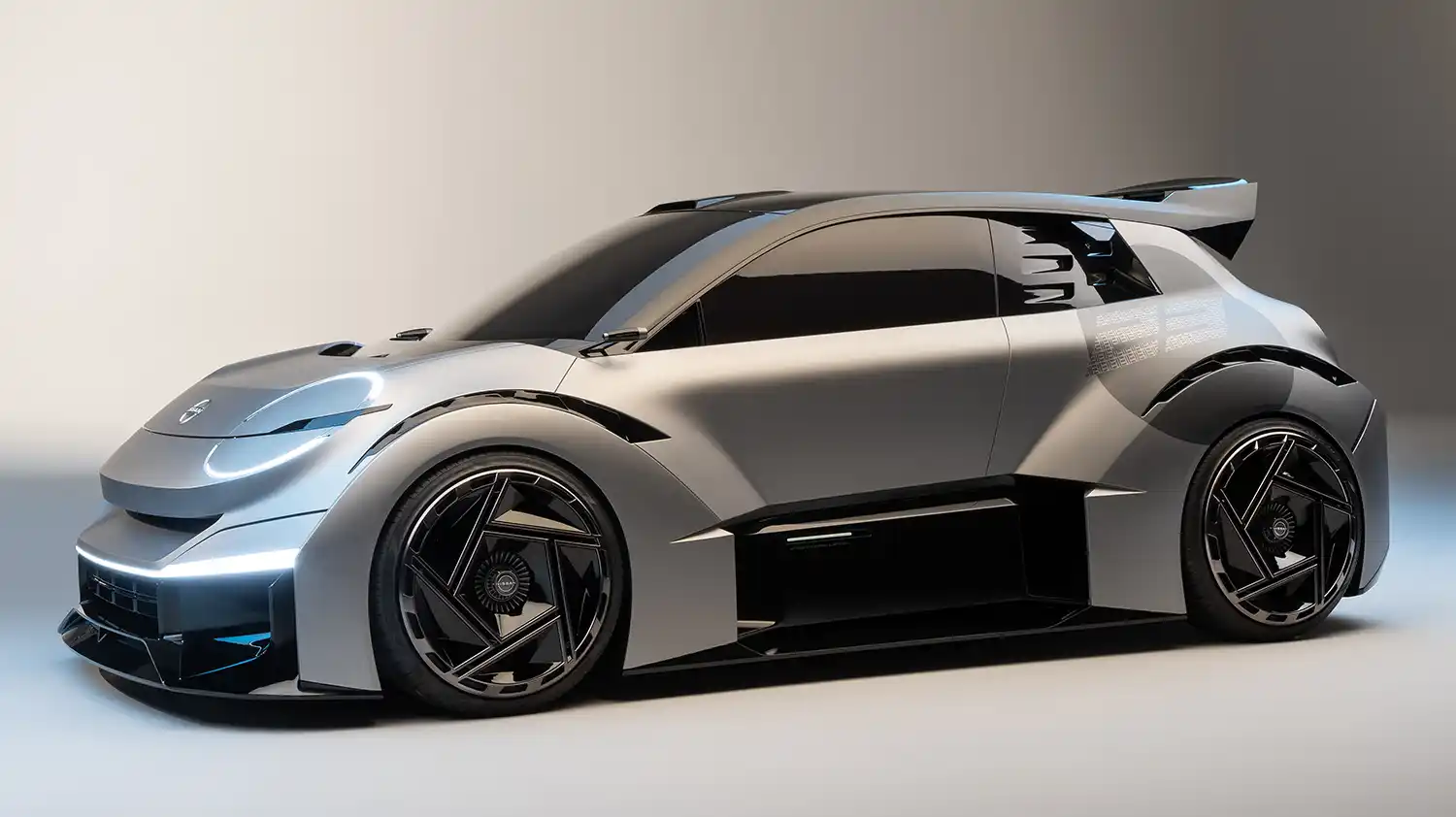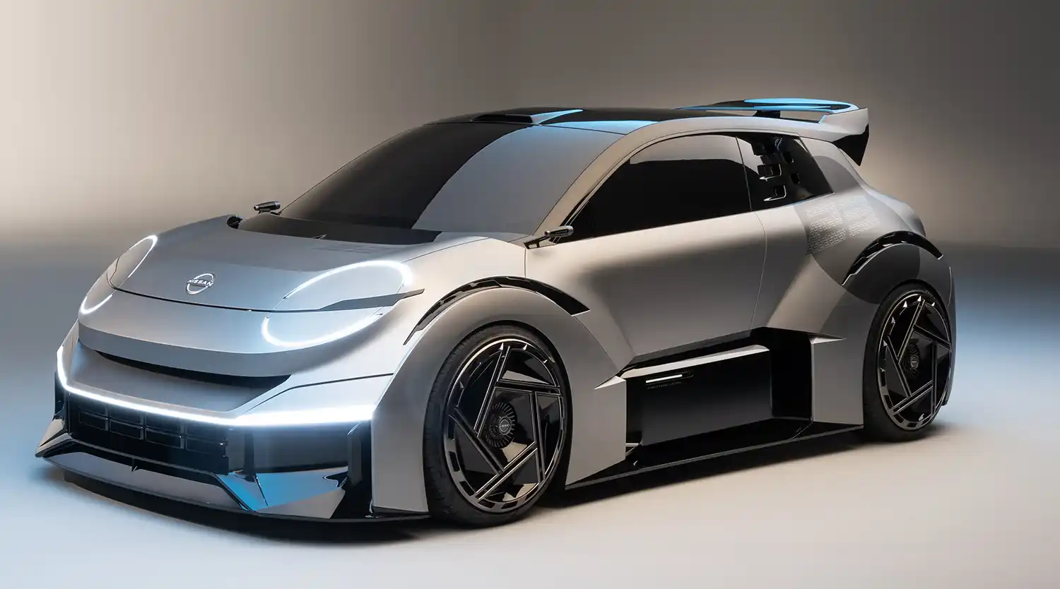 The modern twist on this small car playfulness reflects both the world of online racing and Nissan’s participation in Formula E. The Concept 20-23’s basic 3-door hatchback body-style features extreme aerodynamic addenda front and rear, with deep skirts which direct the airflow away from the front of the car, through apertures to cool the brakes and out through vents just behind the front wheels.