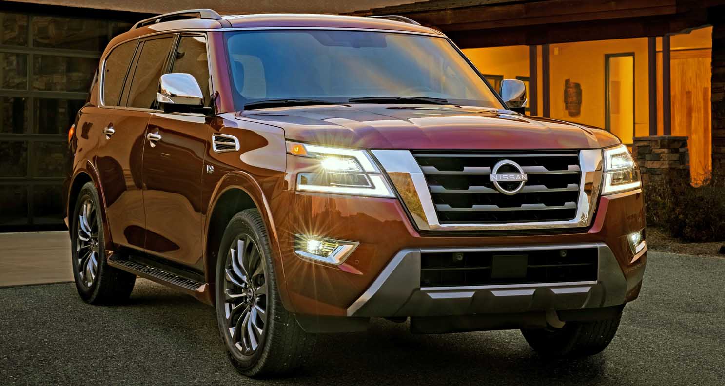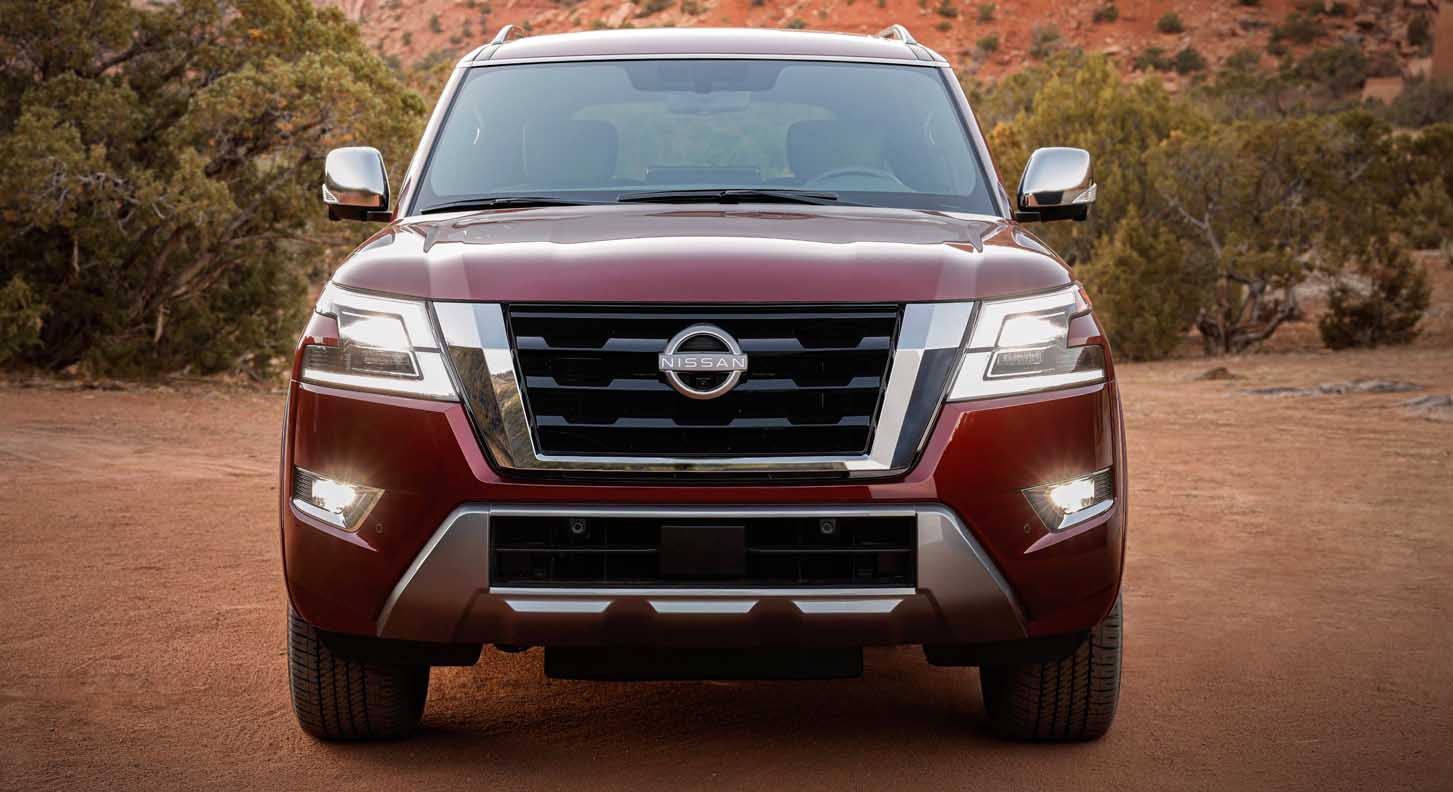 The 2021 Nissan Armada features an extensively redesigned exterior that includes a new grille, hood, front fenders, front and rear bumpers, new LED headlights and taillights and one new exterior color. It is also the first vehicle to carry the new Nissan logo.