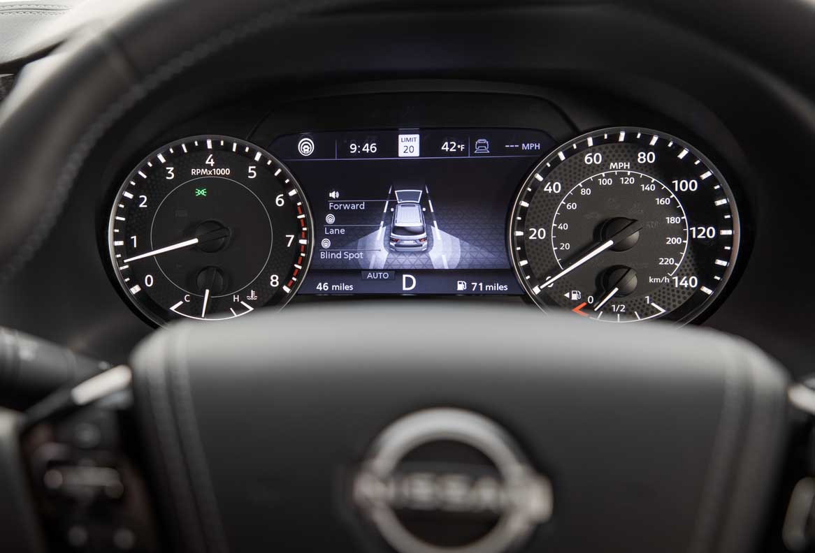 Armada SL and Platinum grades add Intelligent Around View® Monitor, which helps provide extra sets of “eyes” when backing out or parking. The innovative Intelligent Around View® Monitor can also come in handy when negotiating tight off-road trails. Platinum grade adds class-exclusive Traffic Sign Recognition.