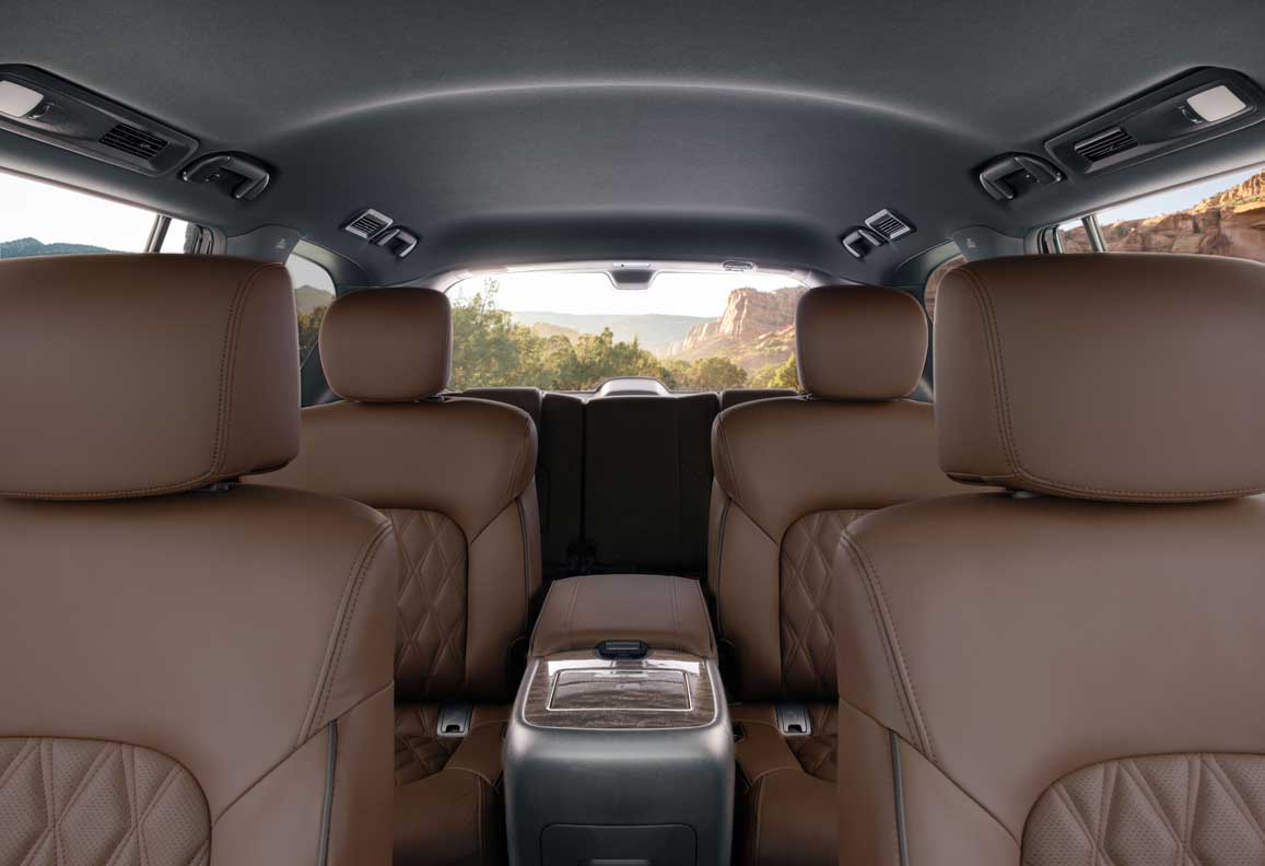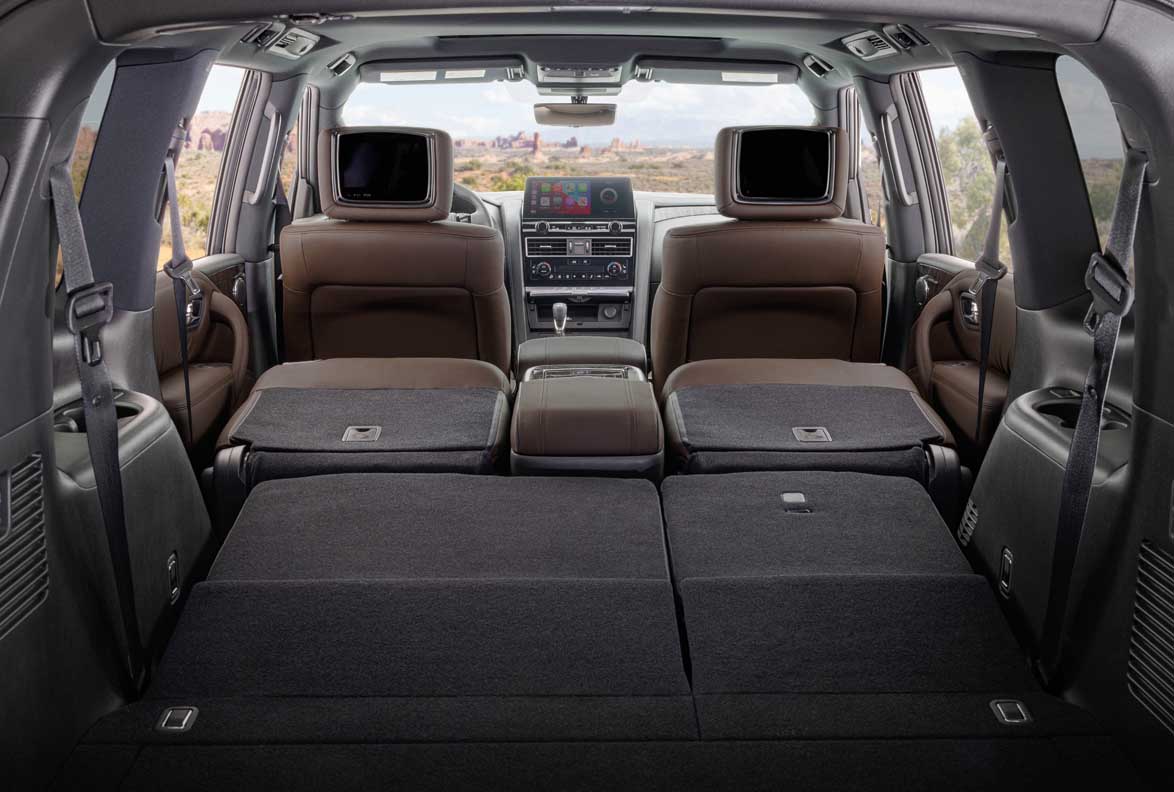 Family adventures are a little more enjoyable thanks to the roomy, 8-passenger Armada interior that offers 40.0 inches of 2nd row headroom and 41.0 inches of 2nd row legroom. The standard seating configuration includes front heated 10-way power-adjustable bucket seats with a large center console, 2nd row fold flat 60/40 split bench seat and 3rd row 60/40-split folding bench seat, which folds flat into the floor for extra cargo carrying flexibility.