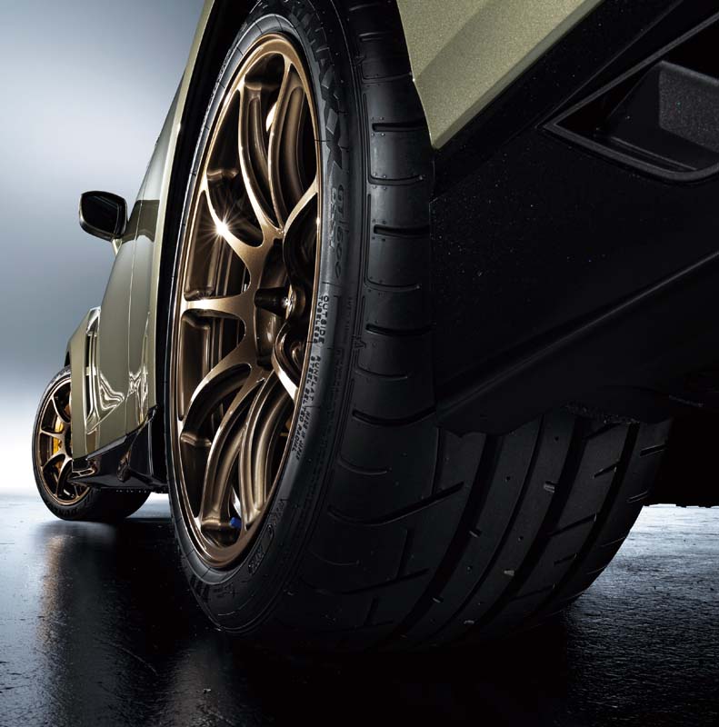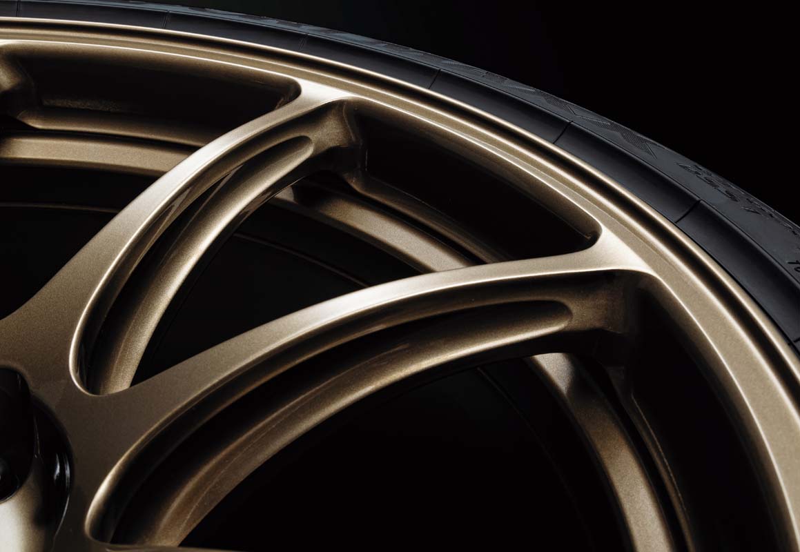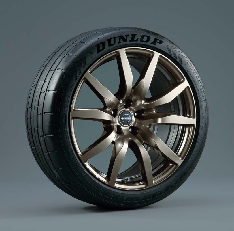 The Nissan GT-R Premium Edition T-spec also has an exclusive interior design, Rays forged alloy wheels (bronze), and suspension that takes advantage of weight reductions below the springs. An expanded wheel-rim width has increased tire rigidity, enabling smooth and sensitive handling.