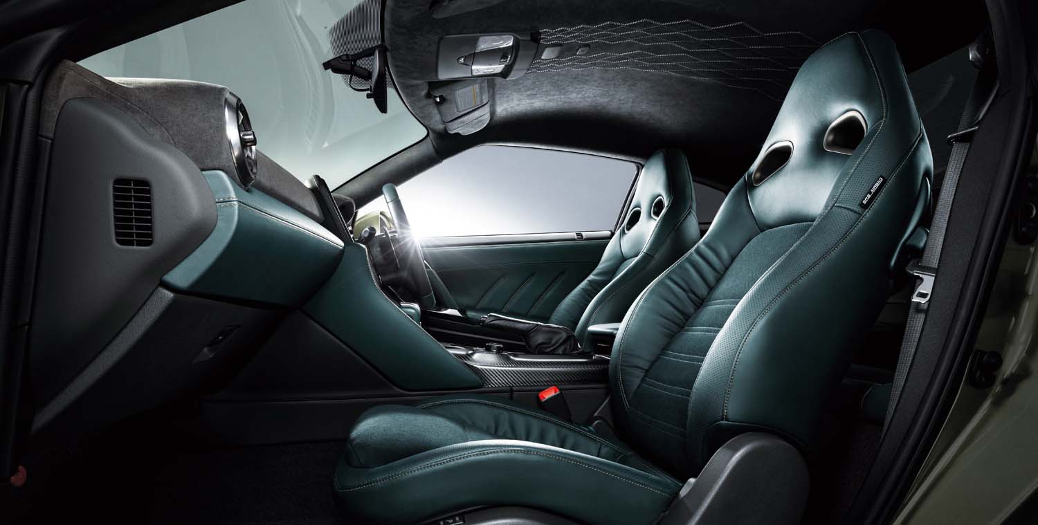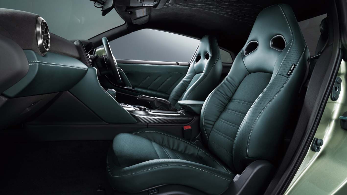 Two new body colors, Midnight Purple and Millennium Jade, have been added to the T-spec options. Midnight Purple is an advanced version of the color used on previous generations of GT-Rs and is inspired by color-shifting of the aurora borealis. Millennium Jade exudes sophistication and conveys a quiet, yet powerful presence.