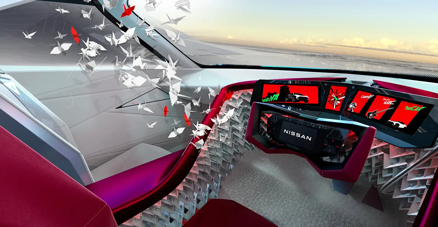 Inside, origami-styled elements mirror Japanese taste and create an interior space where digital and art are fused together. For example, the onboard cameras can capture the scenery around the car and use AI to convert to manga-style scenery or graphic patterns according to the owner’s preferences. The imagery can then be projected on a three-screen display arranged around the driver in the cockpit, creating a space where reality and the world of the metaverse are fused together.