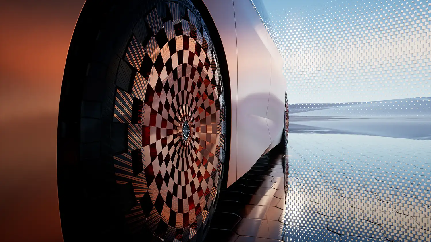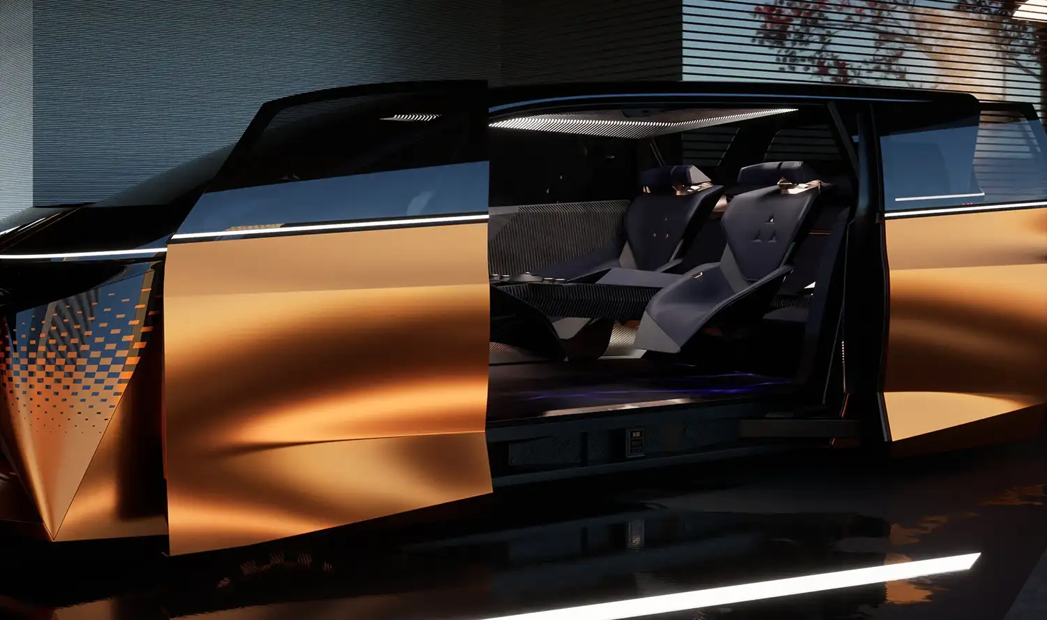 The spacious interior is made possible thanks to the Nissan EV Technology Vision, which consolidates compact components and high-energy density all-solid-state batteries to create innovate car packaging. The result is an ultra-low center of gravity, which when combined with the vehicle’s advanced e-4ORCE all-wheel control system produces smooth and flat acceleration and deceleration. The overhead console and lighting feature traditional Japanese kumiko and koushi patterns that create a sense of luxury, while the flat LED panel in the floor displays imagery of a riverbed and the sky, helping creating a relaxing space where digital and nature are fused.